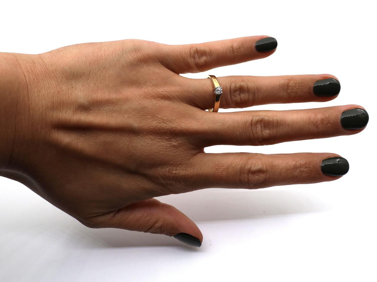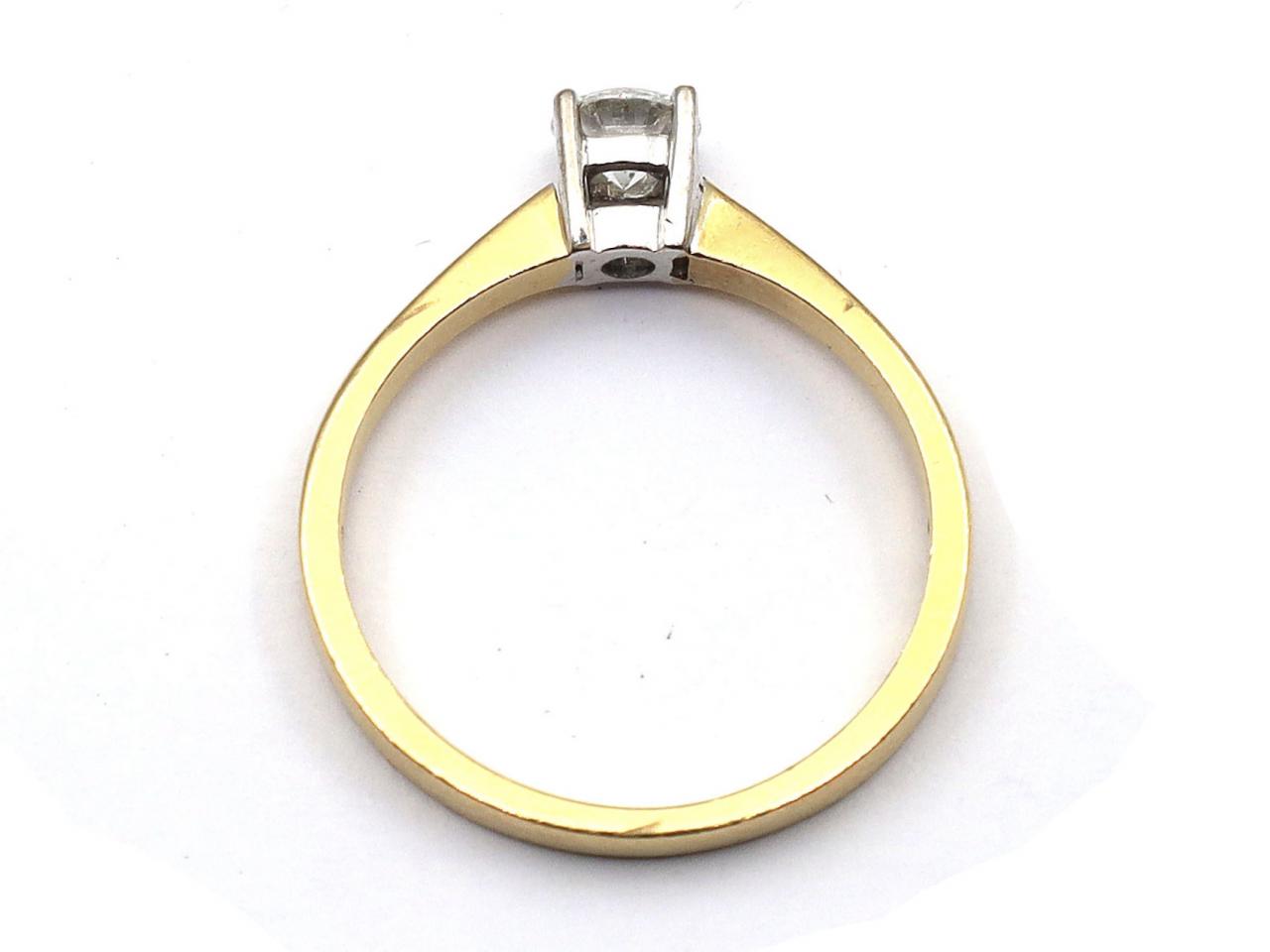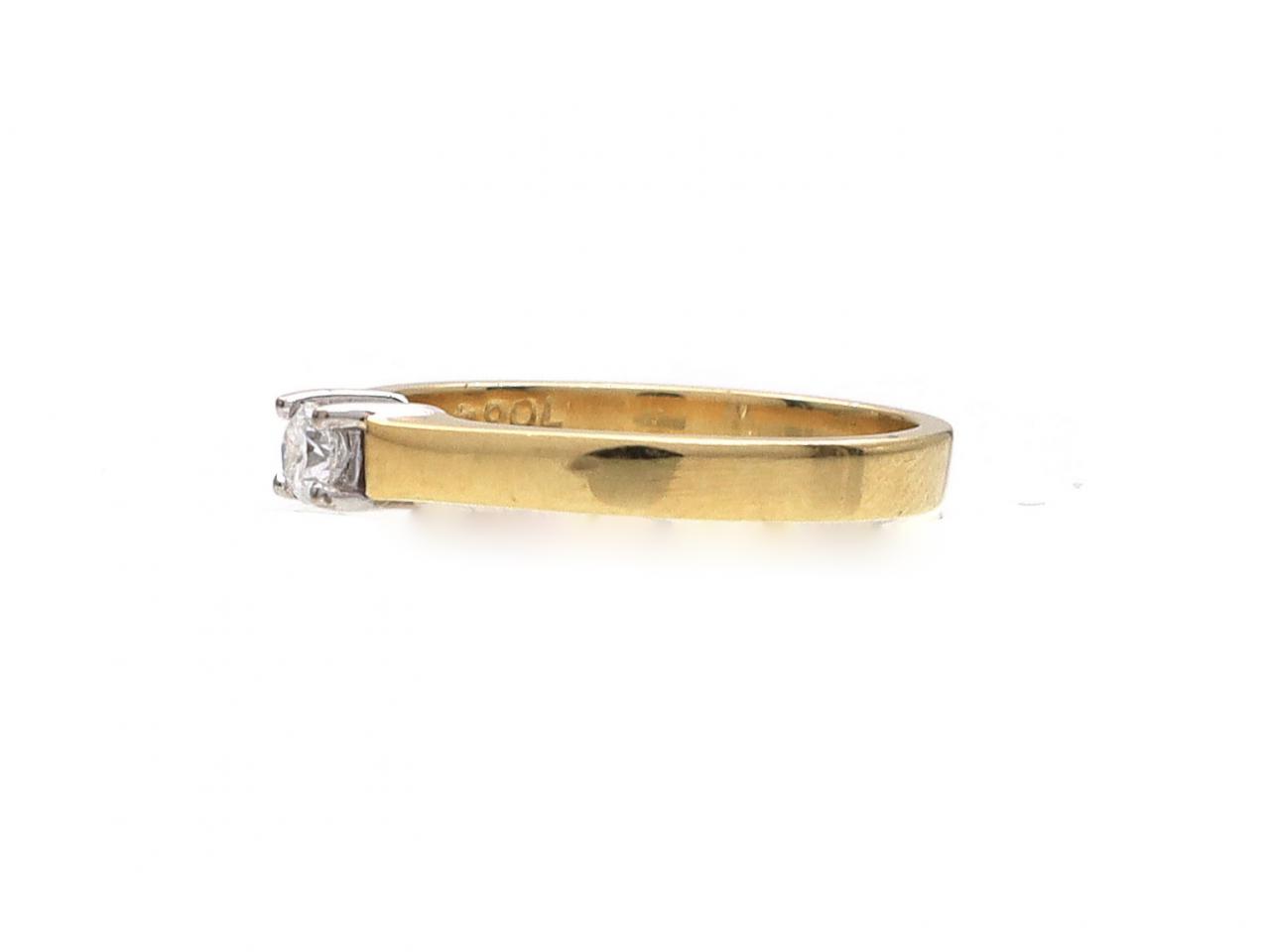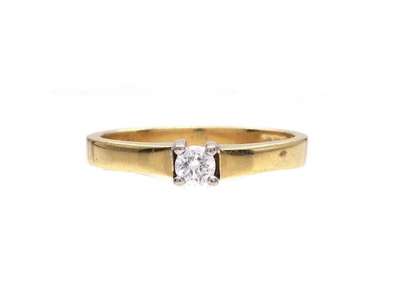 0.12ct round brilliant cut diamond solitaire ring in 18kt yellow gold. Set with a 0.12ct round brilliant cut diamond in a four claw setting, flanked to either side with a raised square shoulders which flow to a solid shank. Hallmarked 18kt gold.