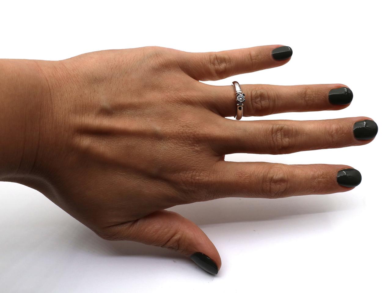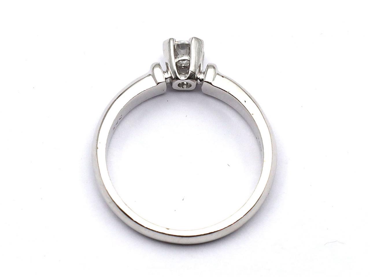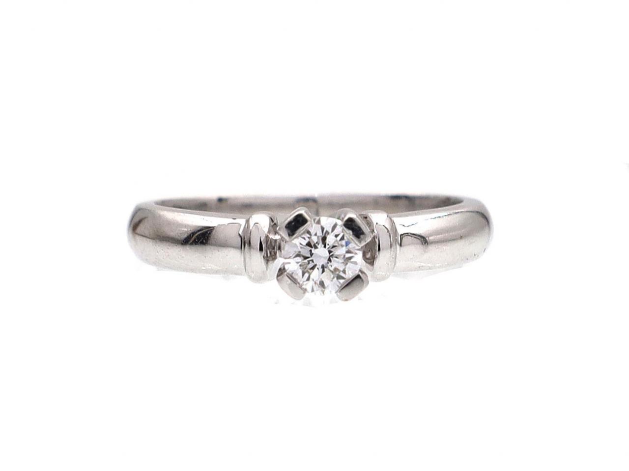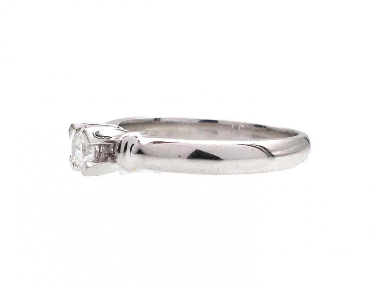 0.20ct round brilliant cut diamond engagement ring in 18kt white gold. Set with a 0.20ct round brilliant cut diamond in a structured four claw collet, to a classic solitaire design with raised collet, the ribbed shoulders smooth to a broad shank. Hallmarked 18kt white gold.