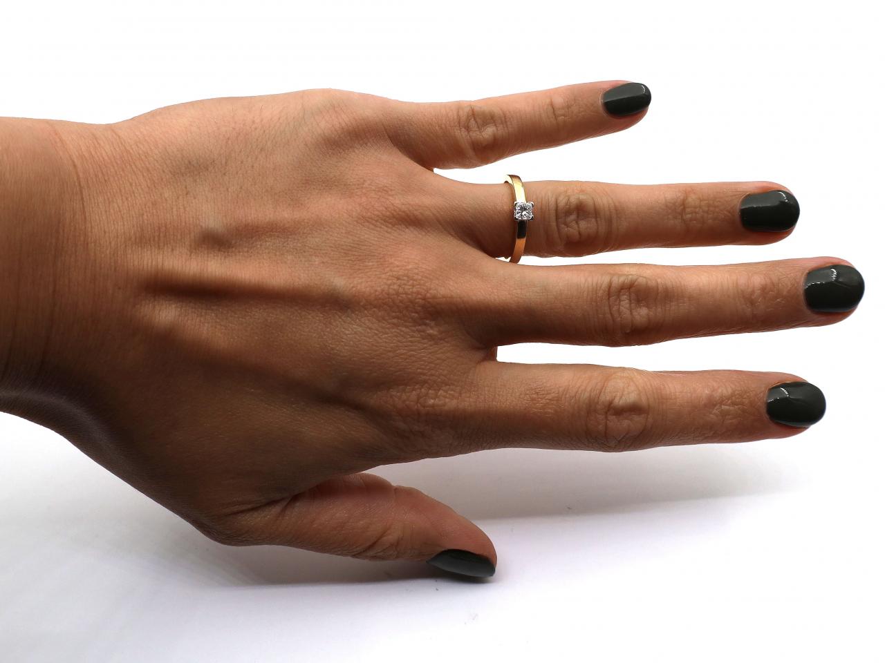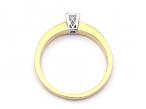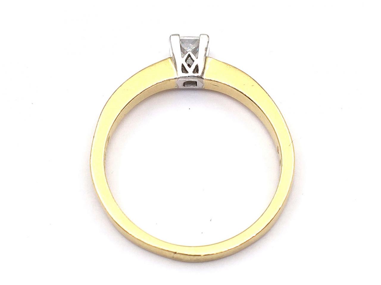 0.23ct square princess cut diamond solitaire in 18kt yellow gold. Set with a square brilliant cut diamond in a raised four claw setting, to a solitaire design with a pierced open decorative collet and met to either side with square shoulders which curve to a solid shank. Numbered '6977'. Hallmarked 18kt gold.
