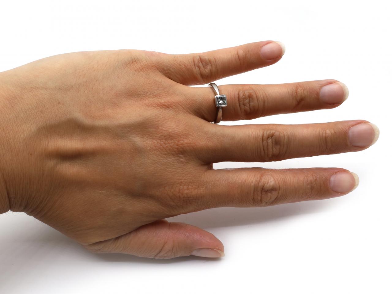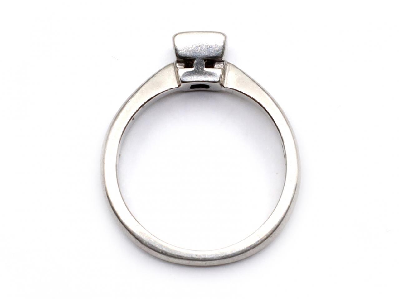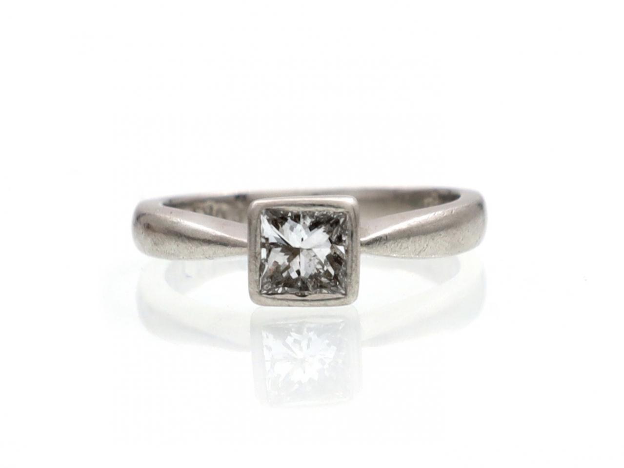 0.47ct square princess cut diamond solitaire ring in platinum. Set with a 0.47ct square brilliant cut diamond in a raised rubover collet setting, to a solitaire design with linear pierced collet, inwardly tapering shoulders which flow to a solid shank. Numbered 'Y5803'. Hallmarked platinum, Sheffield, 2000.