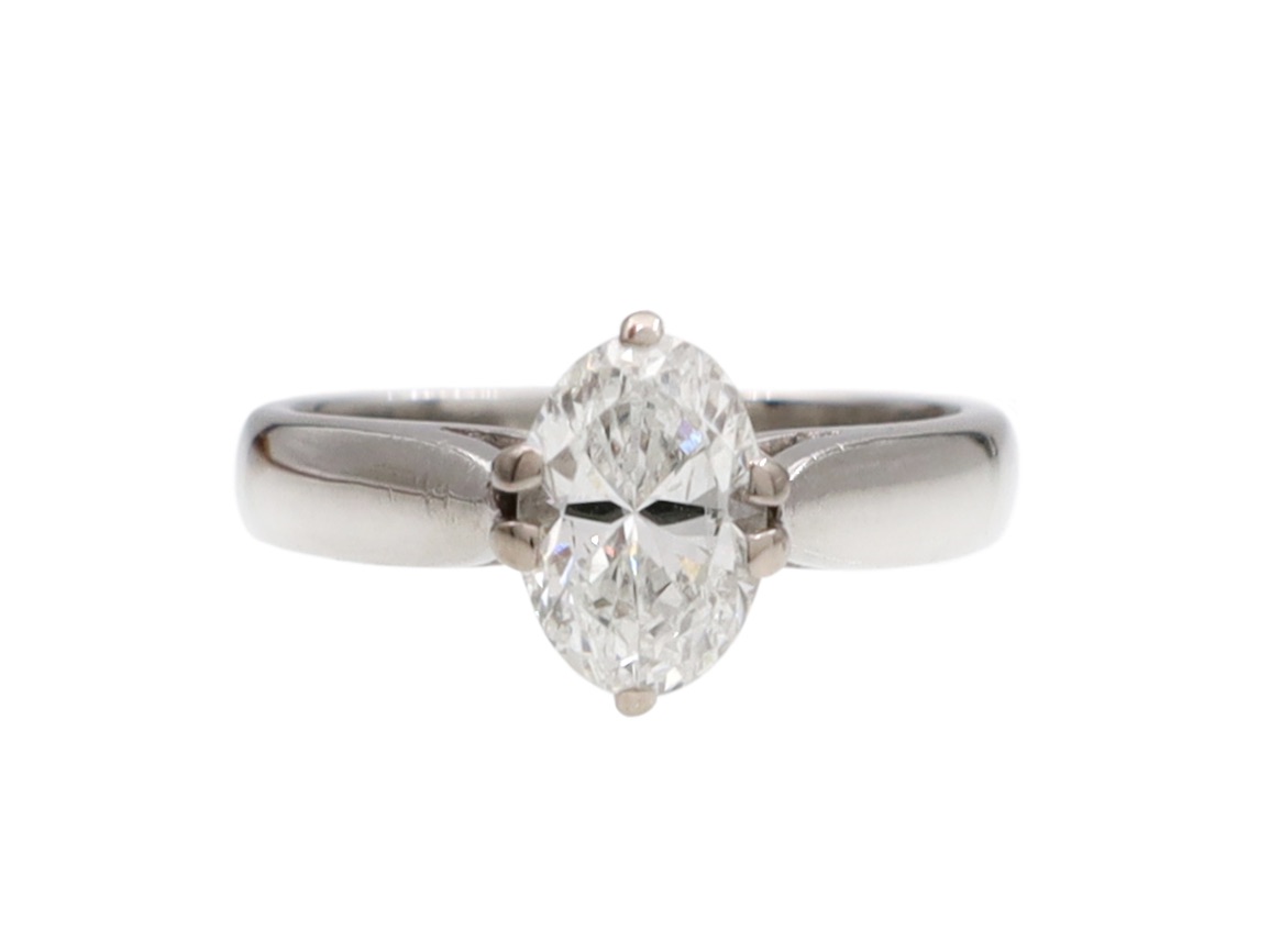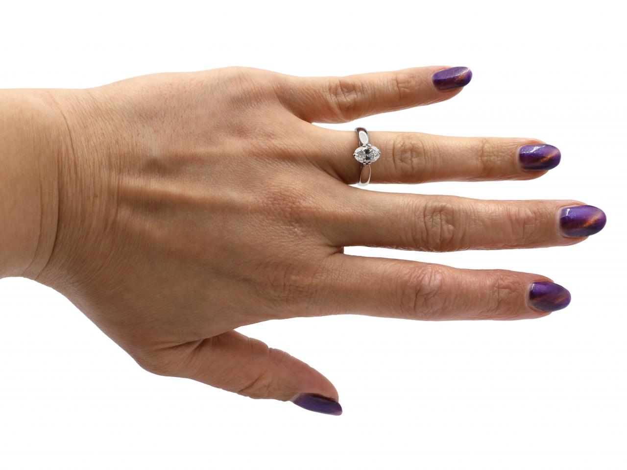 0.60ct moval cut diamond solitaire engagement ring in platinum. Set with an estimated 0.60ct elongated moval brilliant cut diamond in a compass split claw setting, to a raised solitaire design with curving claws, openwork collet and met to either side with raised inwardly tapering shoulders which smooth to a broad solid shank. Hallmarked platinum.