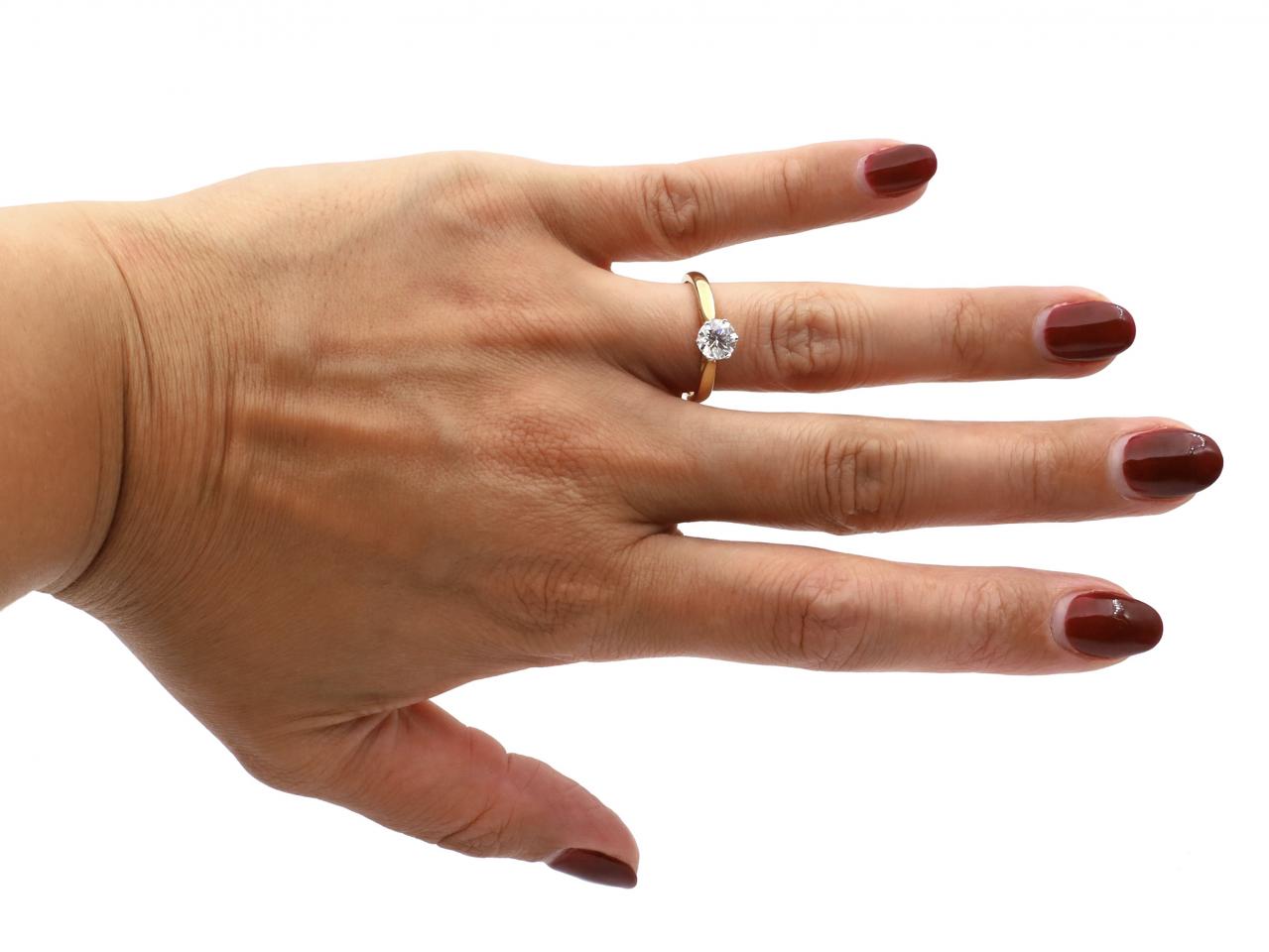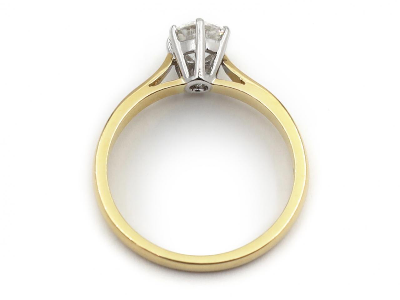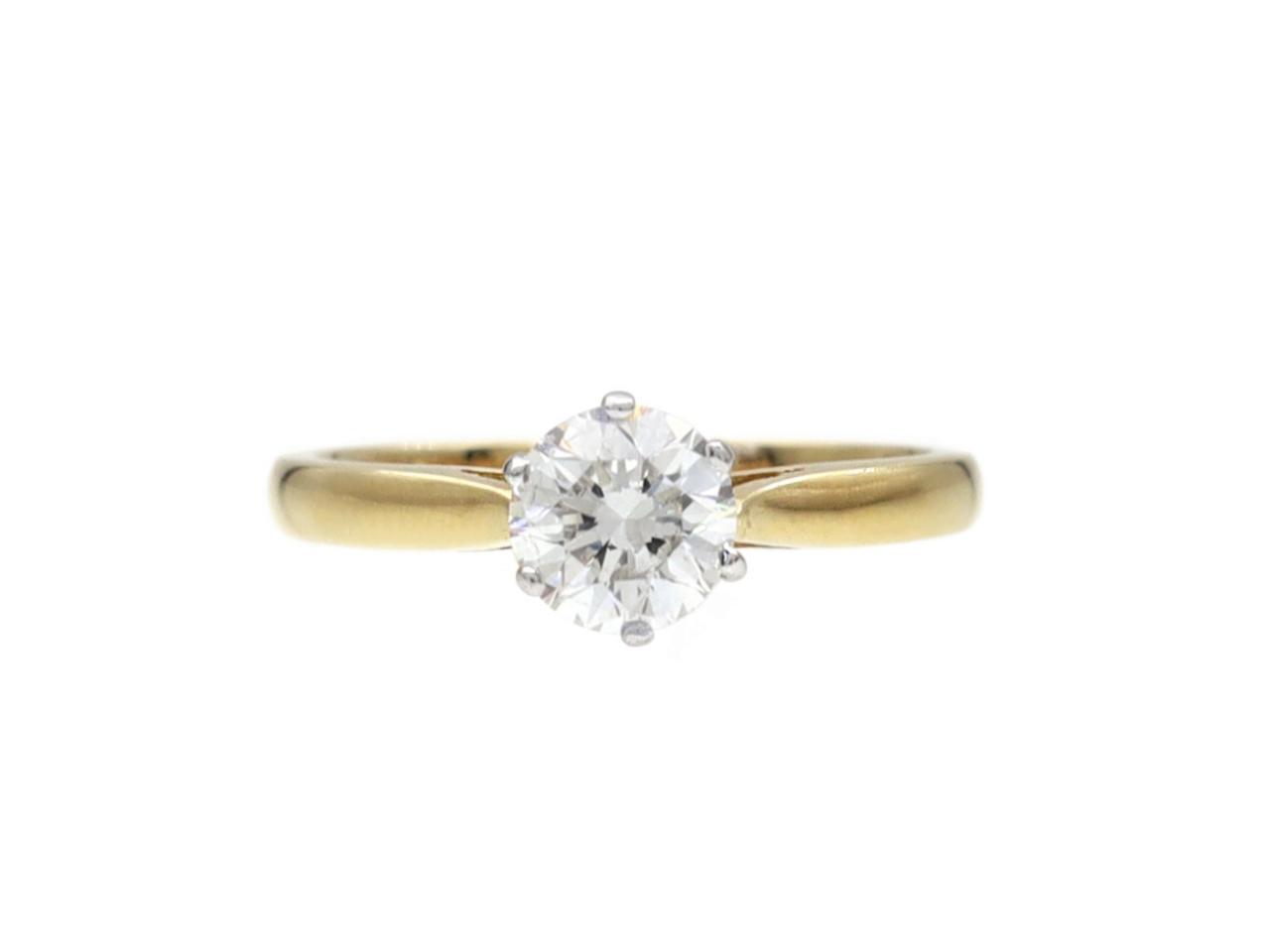 0.72ct round brilliant cut diamond solitaire engagement ring in 18kt yellow gold. Set with an estimated 0.72ct round brilliant cut diamond, G colour, VS2 clarity, in a raised claw setting, to a traditional solitaire design centred with a circular collet with curving claws and flanked to either side with raised inwardly tapering shoulders which smooth to a solid shank. Hallmarked 18kt gold, London. Accompanied by Gemological Institute of America certificate.