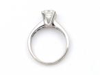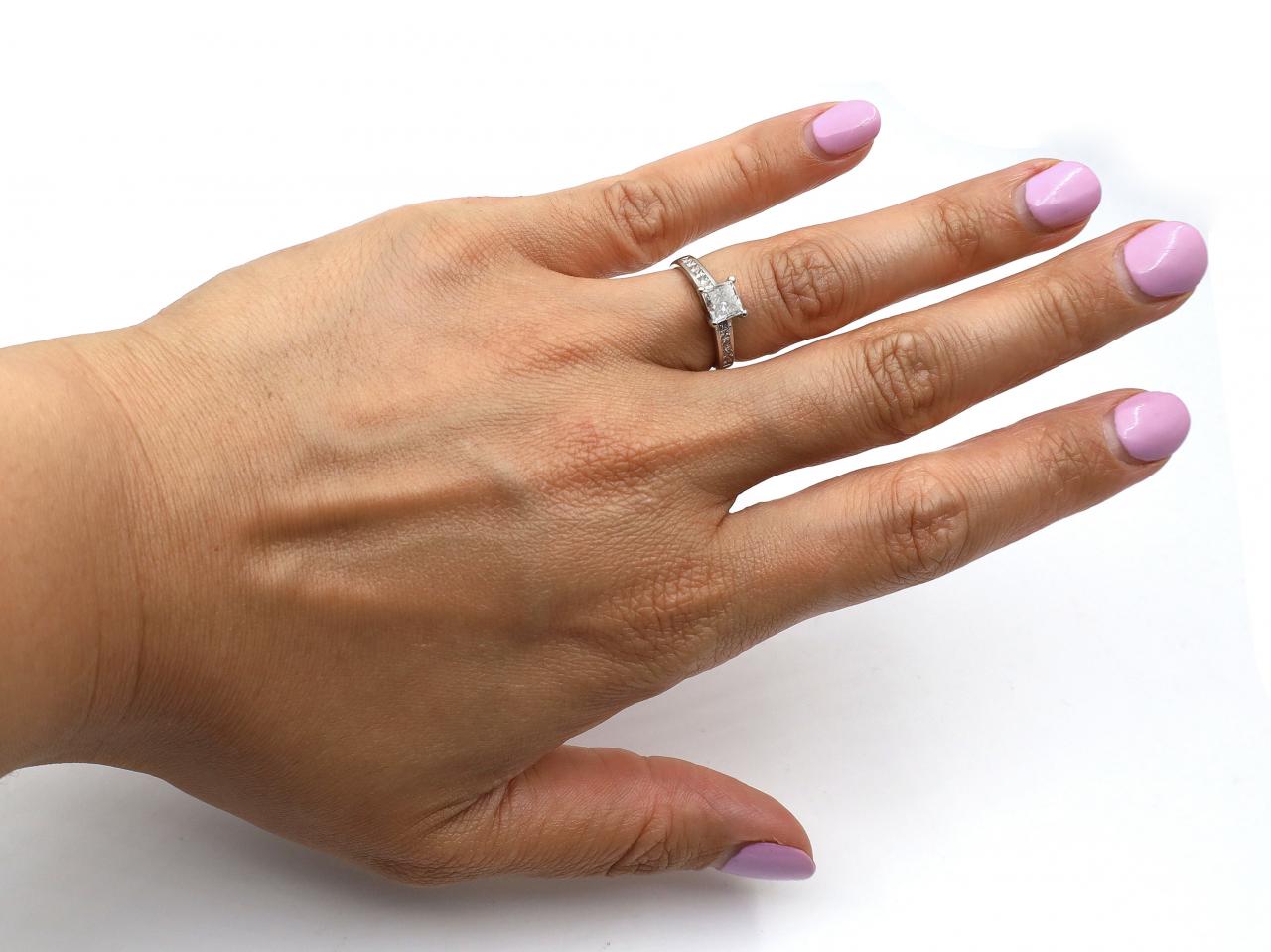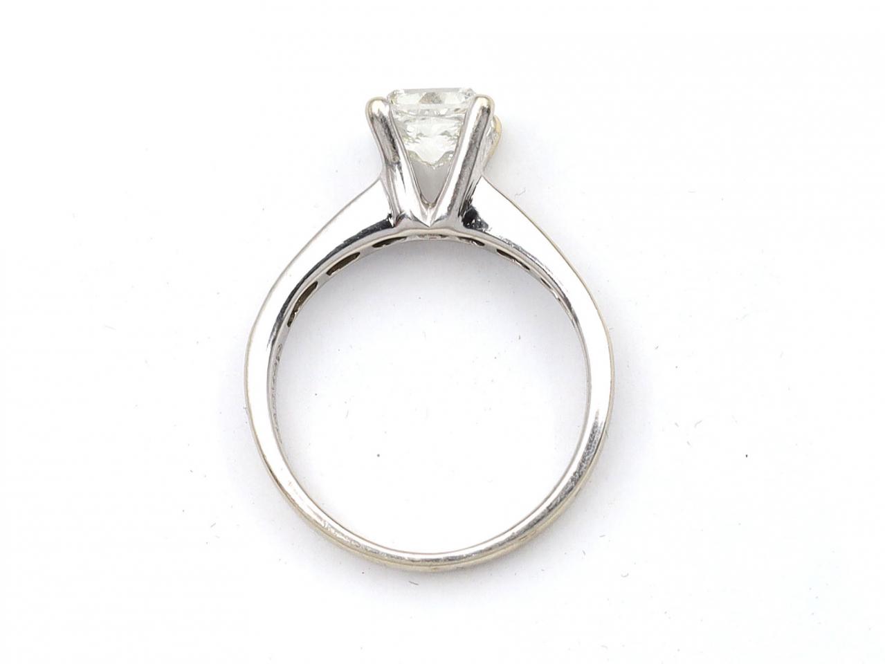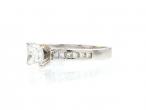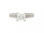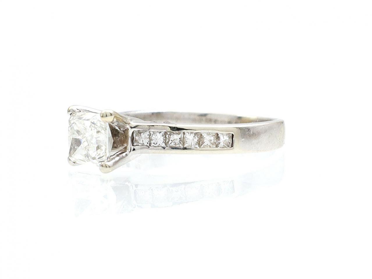 0.85ct square brilliant cut diamond engagement ring in 18kt white gold. Centred with an 0.85ct square brilliant cut diamond, J colour, VS1 clarity in a raised four claw setting, set to either side with square brilliant cut diamonds in channel settings terminating to a solid shank. Marked 18kt gold. Accompanied by Gemological Institute of America certificate.