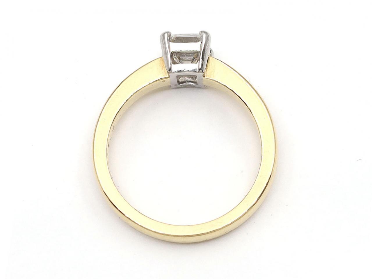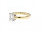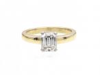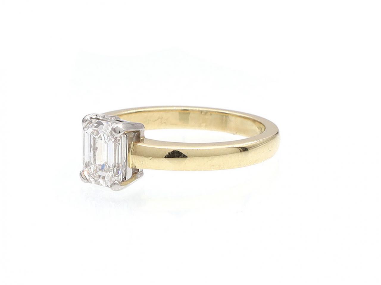 1.01ct emerald cut diamond solitaire engagement ring in 18kt yellow gold. Set with a 1.01ct octagonal emerald cut diamond, H colour, VS2 clarity, in a raised open four claw collet in platinum, flanked to either side with slightly trumpeting shoulders which curve to a solid shank. Hallmarked 18kt gold. Accompanied by HRD Antwerp certificate.