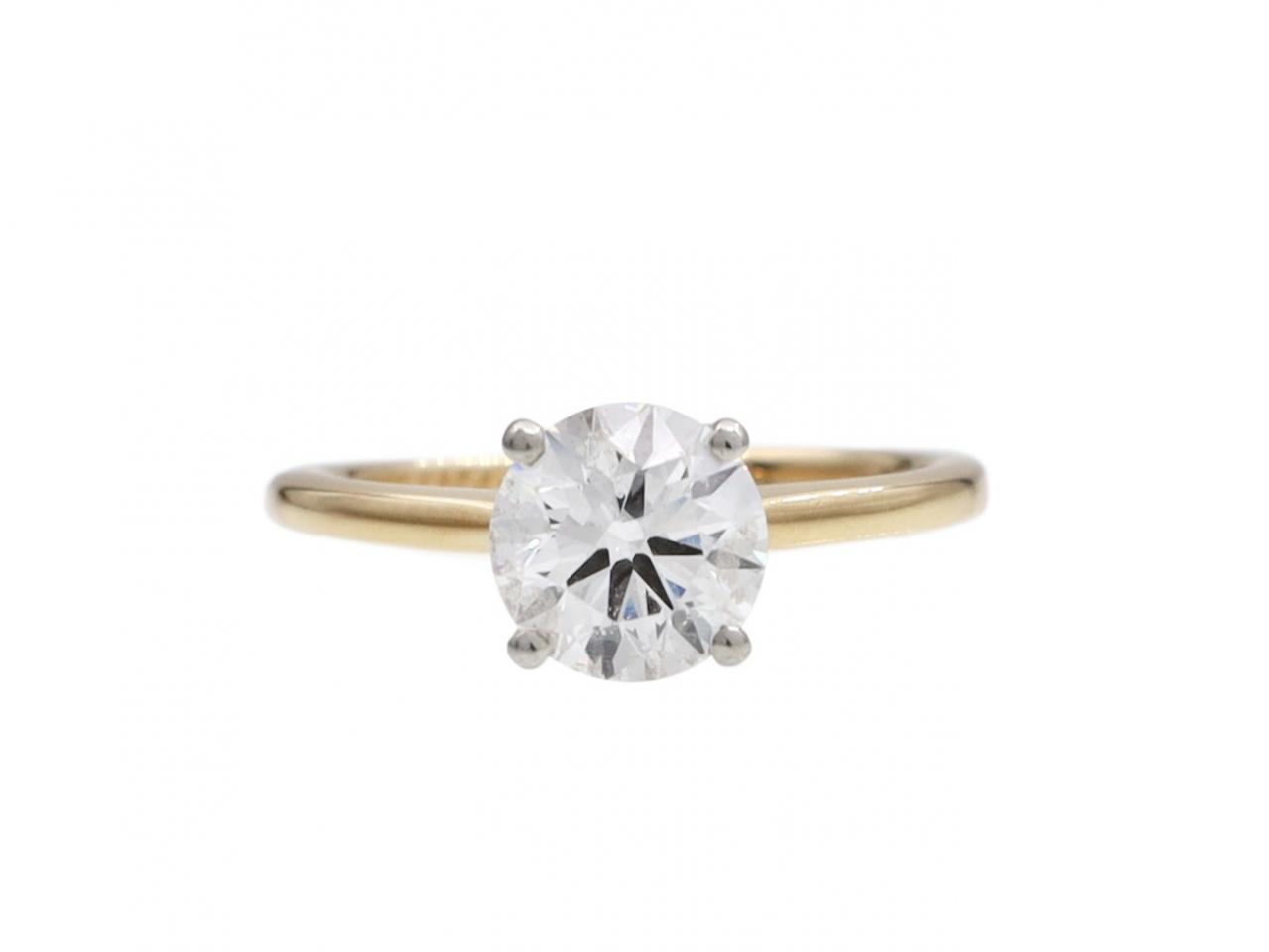 1.11ct round brilliant cut diamond solitaire engagement ring in 18kt yellow gold. Set with a 1.11ct round brilliant cut diamond, D colour, SI2 clarity, in a raised four claw setting, to a solitaire design with curving claws, and met to either side with raised inwardly tapering shoulders which flow to a slim shank. Hallmarked 18kt gold. Accompanied by Gemmological Institute of America certificate.