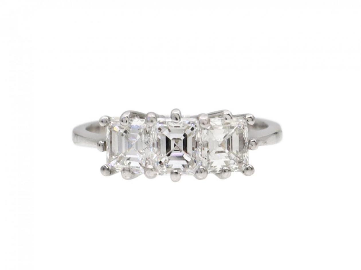 1.50ct three stone Asscher cut diamond ring in 18kt white gold.