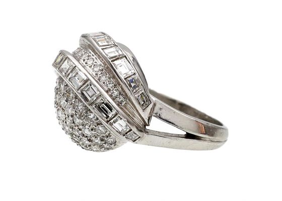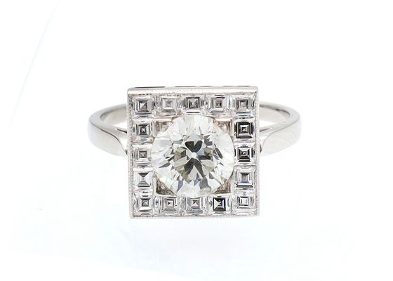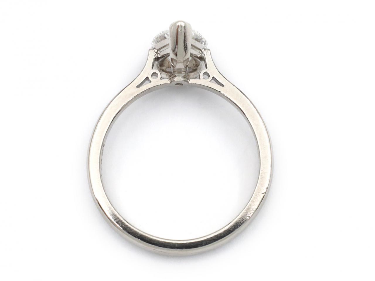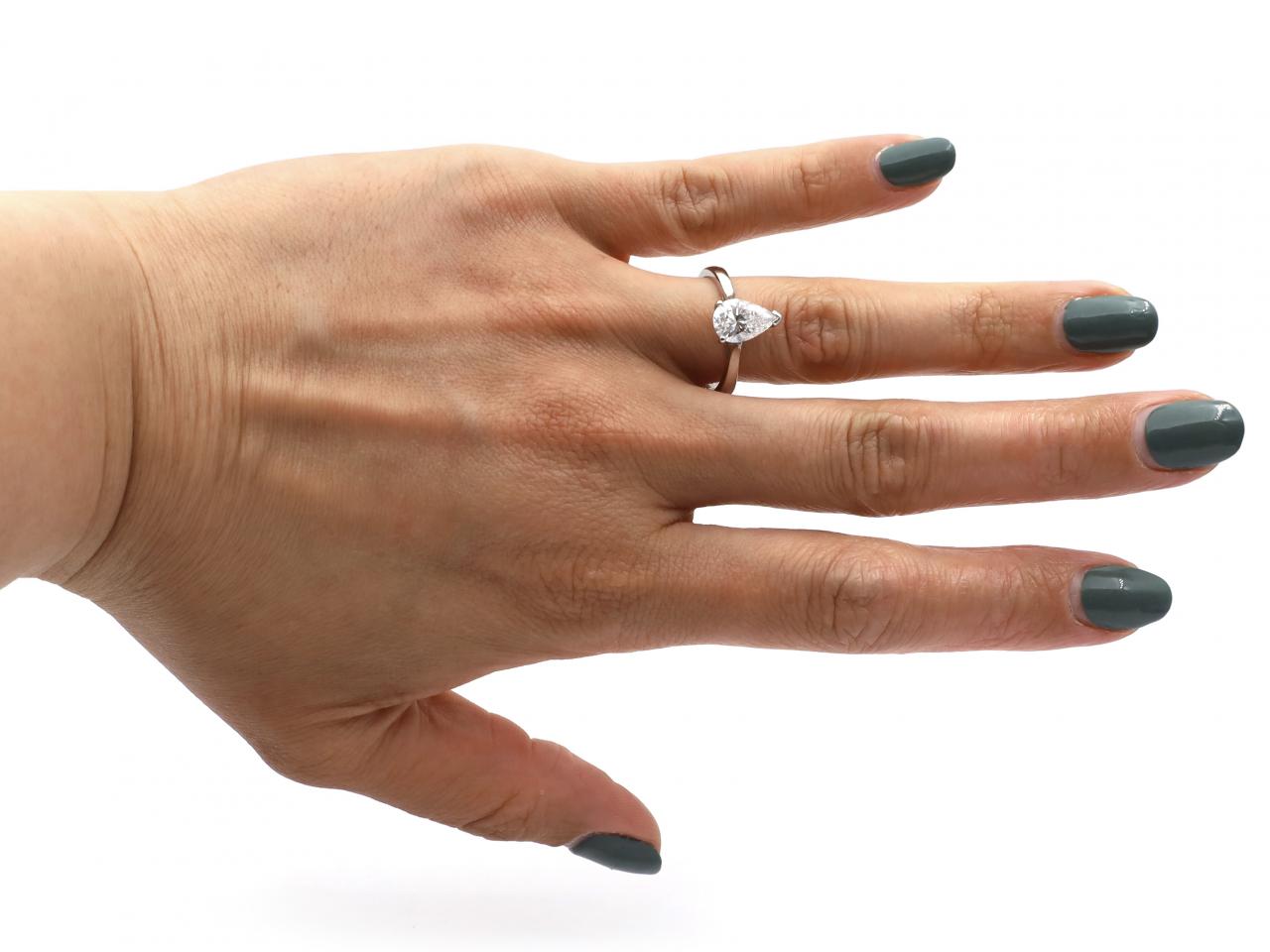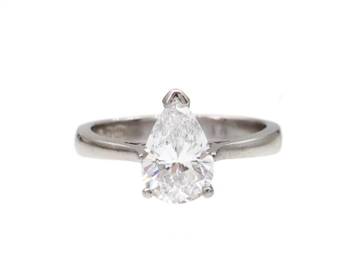 1.52ct pear shape diamond solitaire engagement ring in platinum. Set with an estimated 1.52ct pear brilliant cut diamond, D colour, SI1 clarity in a claw setting, to an elegant solitaire design with bespoke collet featuring incised linear panels, curving claws and fitted to either side with raised inwardly tapering shoulders which smooth to a solid shank. Hallmarked platinum. Accompanied by Gemological Institute of America certificate.