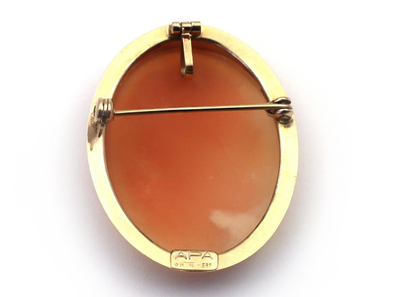 14kt yellow gold shell cameo brooch with the profile of a lady. Set with an oval shell cameo carved to reveal the side profile of a lady with an elegant up-do and floral background, set in a rubover setting and bordered by a polished frame, fitted to the reverse with a secure hinged pin and safety latch and hinged bale to top. Marked 14kt gold.
