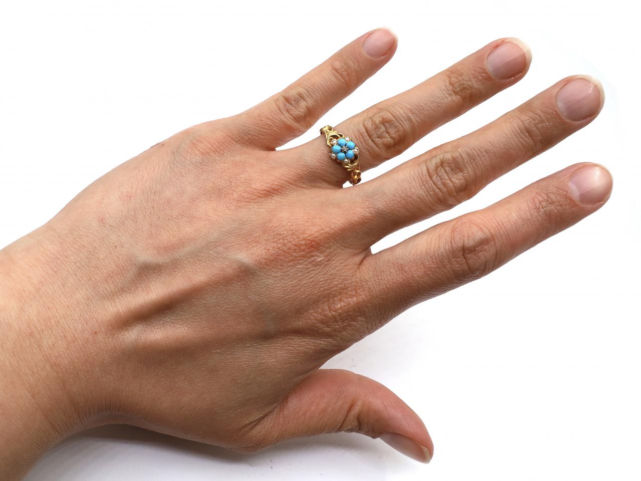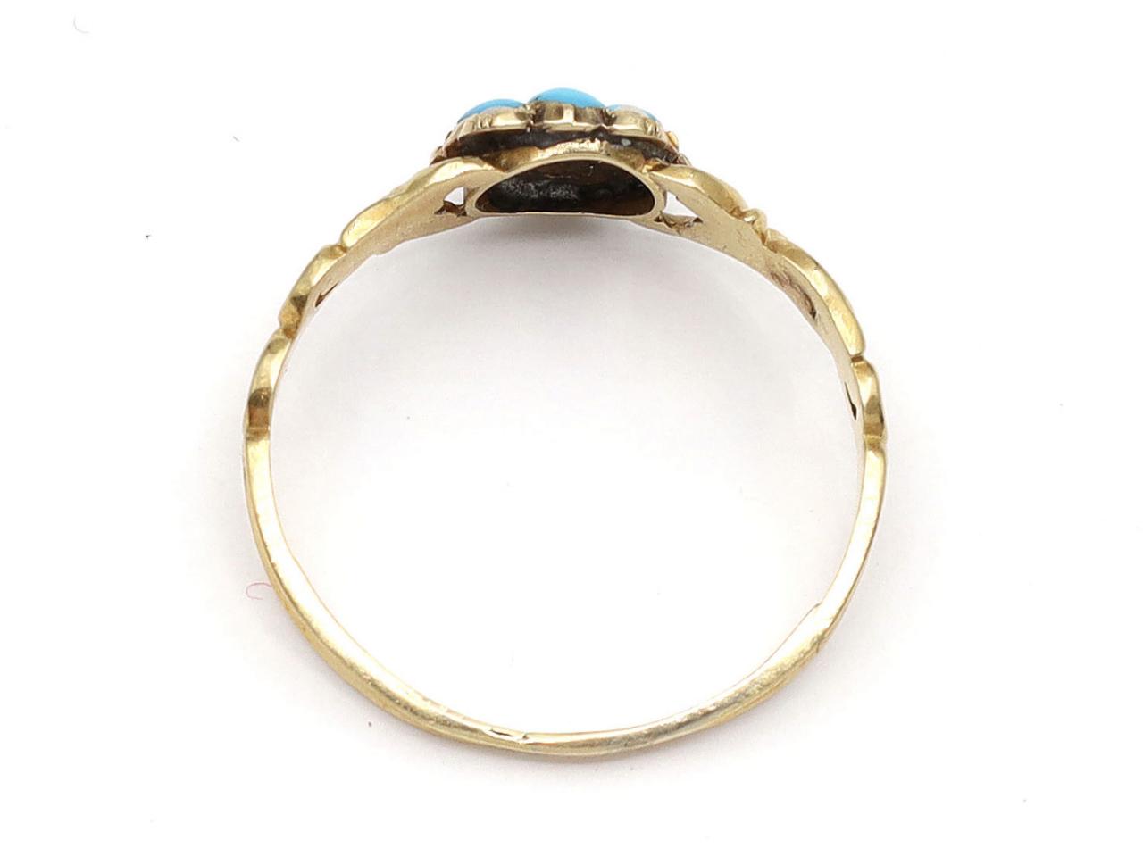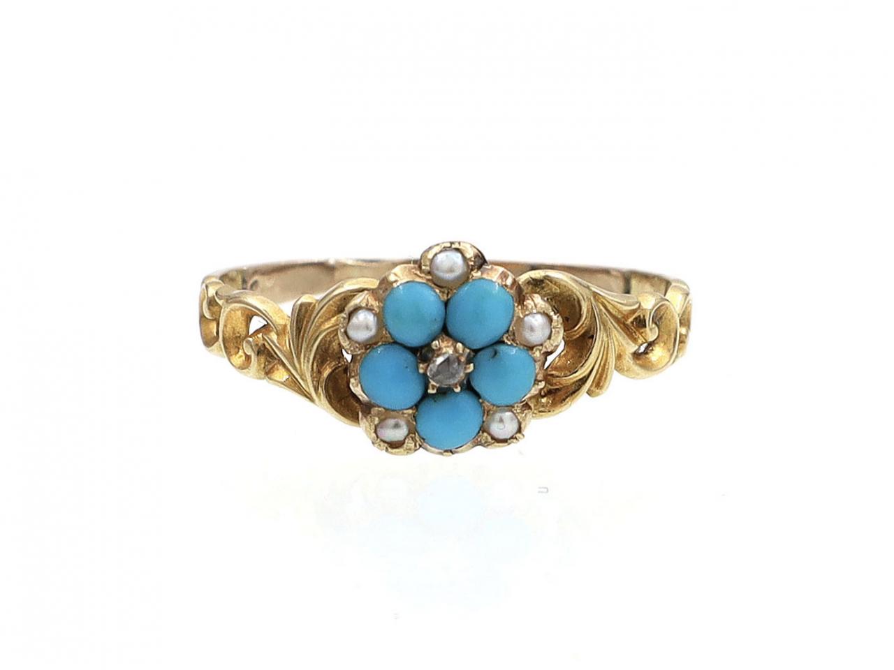 1870s diamond, turquoise and seed pearl floral cluster ring in 18kt yellow gold.