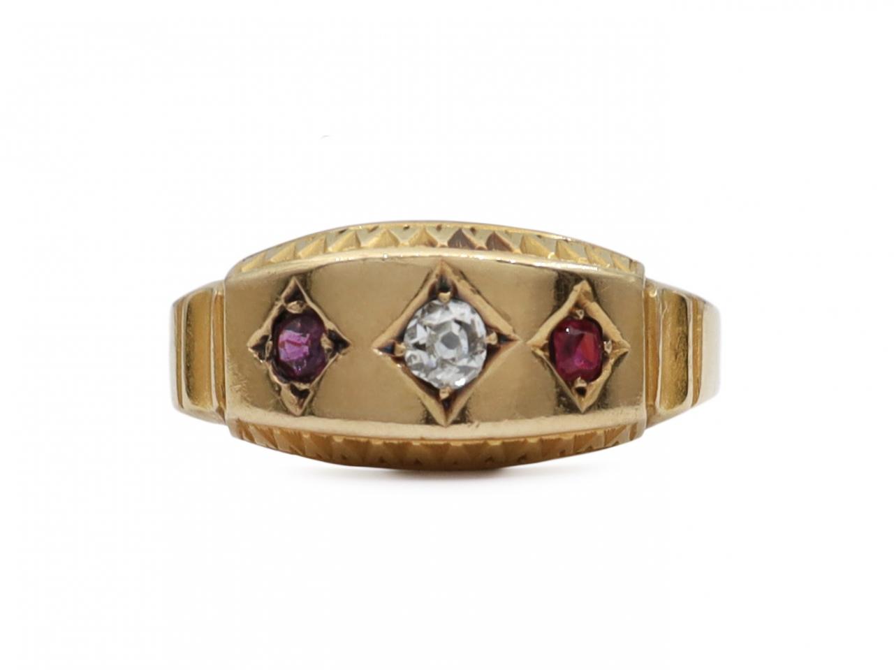 1883 diamond and ruby three stone gypsy ring in 18kt yellow gold. Centred with a cushion shape Old Mine cut diamond in a diamond shape setting, flanked to either side with two cushion shape mixed cut rubies in diamond shape setting, to a curved plaque ring with flush settings, incised gallery and trumpeting shoulders which taper to a solid shank. Hallmarked 18kt gold, Chester, 1883.