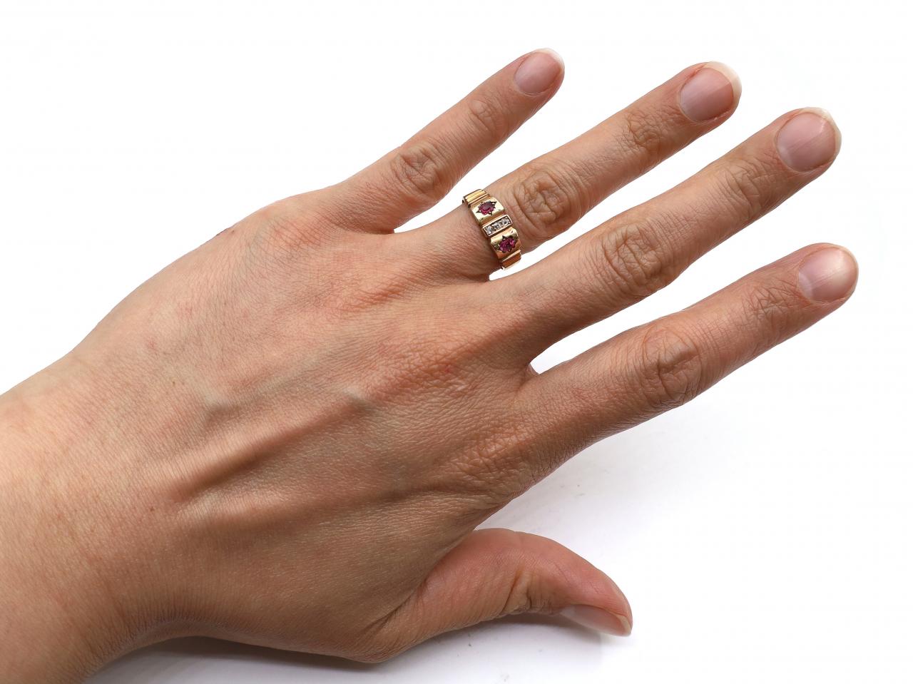 1889 diamond and ruby gypsy ring in 15kt yellow gold. Centred with a vertical row of round rose cut diamonds in grain settings, flanked on either side with two cushion shape mixed cut rubies in gypsy star settings, to a incised gypsy ring with intergrated trumpeting shoulders with ribbed details terminating to a solid shank. Hallmarked 15kt gold, Birmingham, 1889.