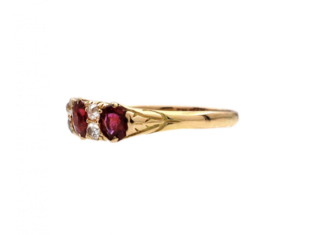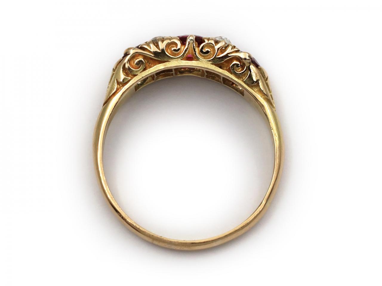 1889 ruby and diamond three stone carved ring in 18kt yellow gold. Set with three round mixed cut rubies in claw settings, alternating with four vertically set cushion shape Old Mine cut diamonds, to a three stone design with stylised claws, carved scrolling gallery and trumpeting shoulders which curve to a solid shank. Hallmarked 18kt gold, Birmingham, 1889.
