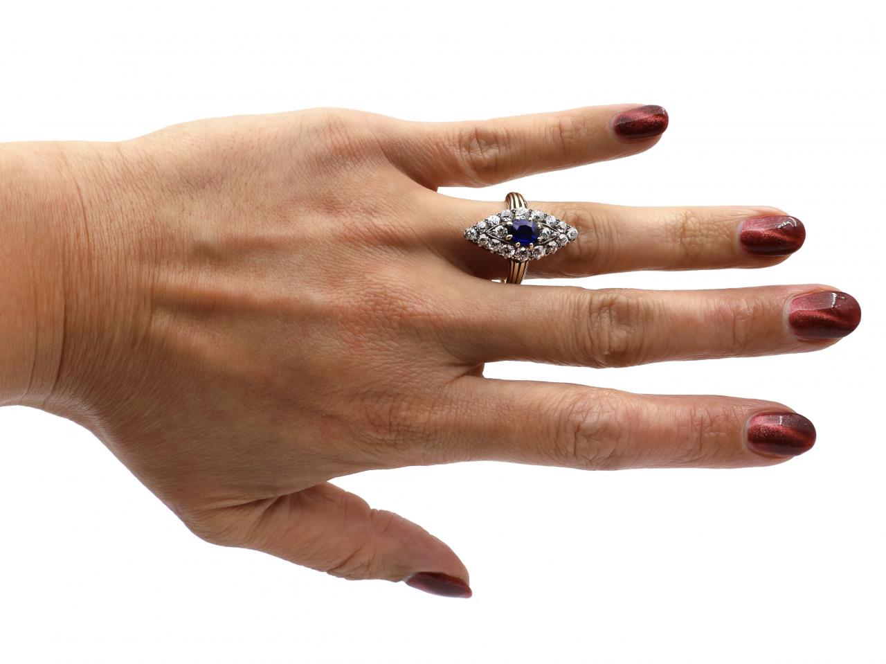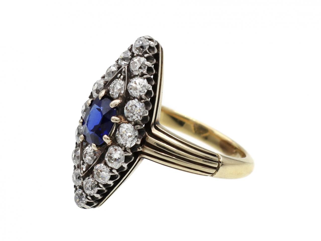1890s sapphire and diamond navette cluster ring in silver on 18kt yellow gold. Centred with an oval mixed cut sapphire in a claw setting, surrounded by round Old European cut diamonds in grain and claw settings, to a marquise cluster with curving claws,l finely pierced gallery and flanked to either side with trumpeting ribbed shoulders which terminate to a solid shank.