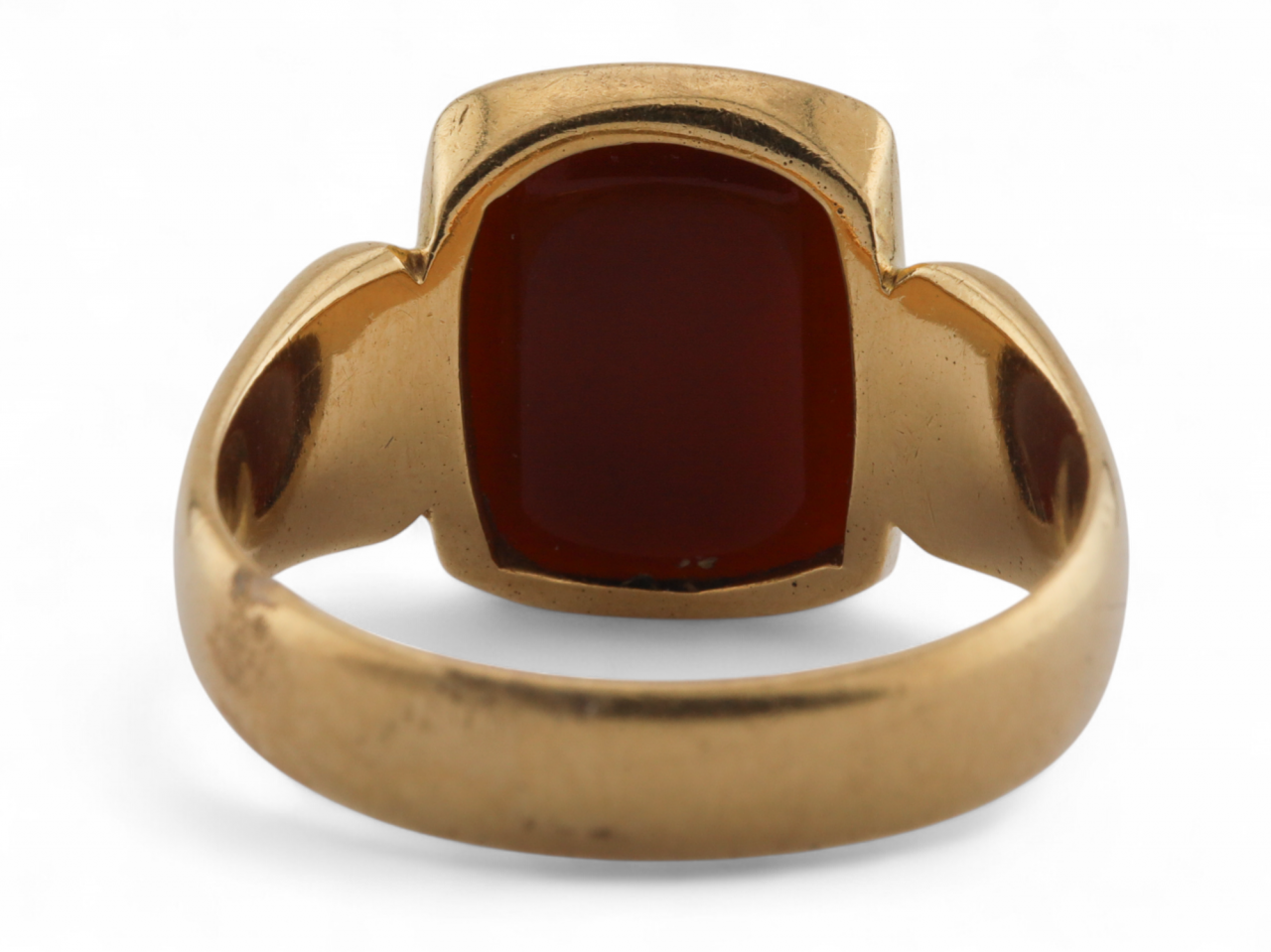 Antique rectangular carnelian signet ring in 18kt yellow gold. Set with a cushion shape rectangular carnelian tablet in a rubover setting, to a rectangular signet ring with step down bombe shoulders which taper to a solid shank. Hallmarked 18kt gold, London, 1893.