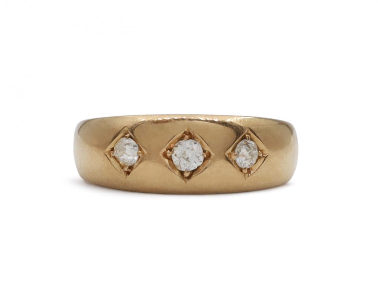 1894 diamond three stone gypsy ring in 18kt yellow gold. Set across the finger with three cushion shape Old Mine cut diamonds in diamond shape inbedded settings, to a three stone band with smooth settings featuring integrated shoulders which curve to a solid shank. Estimated total diamond weight 0.15cts. Hallmarked 18kt gold, Chester, 1894.