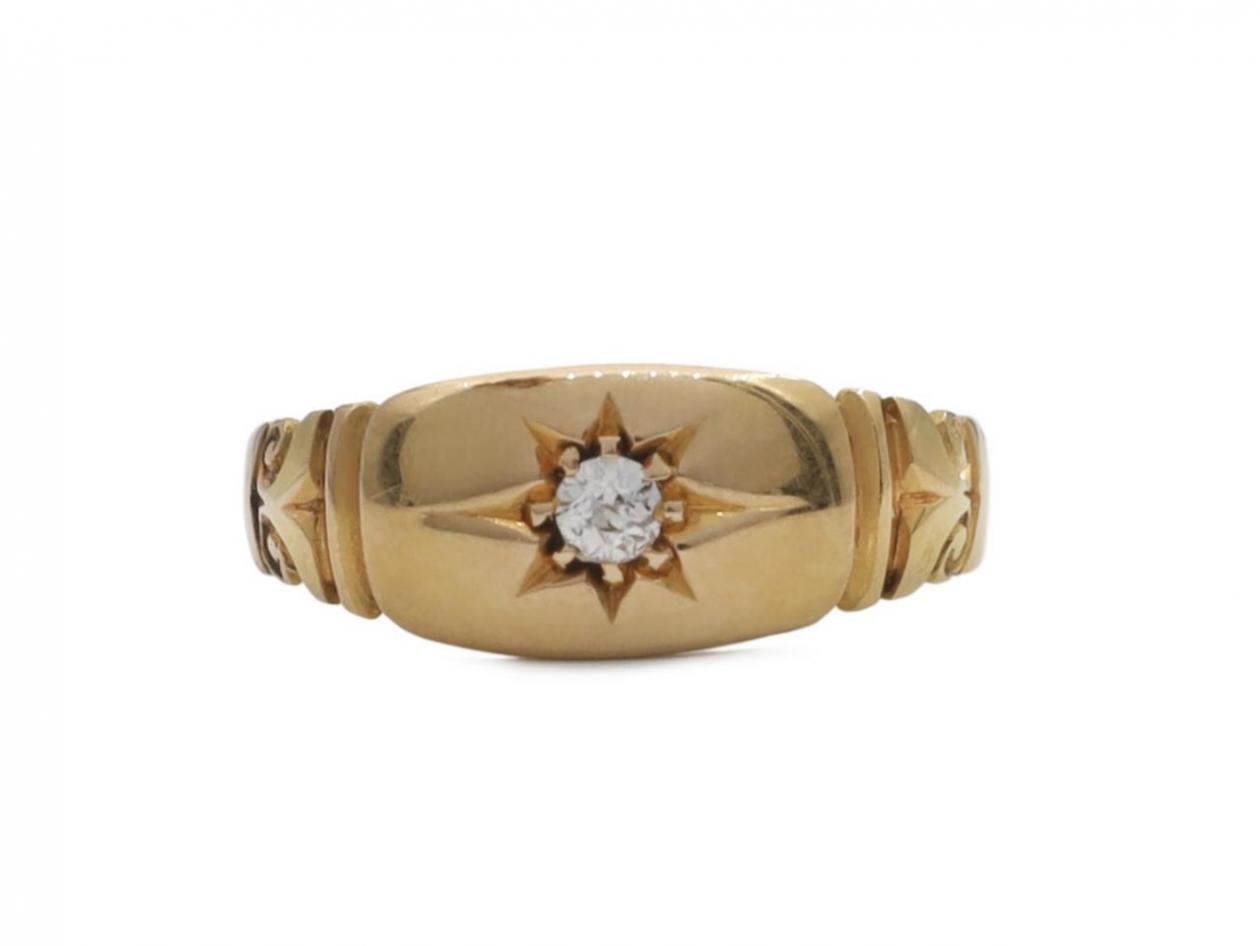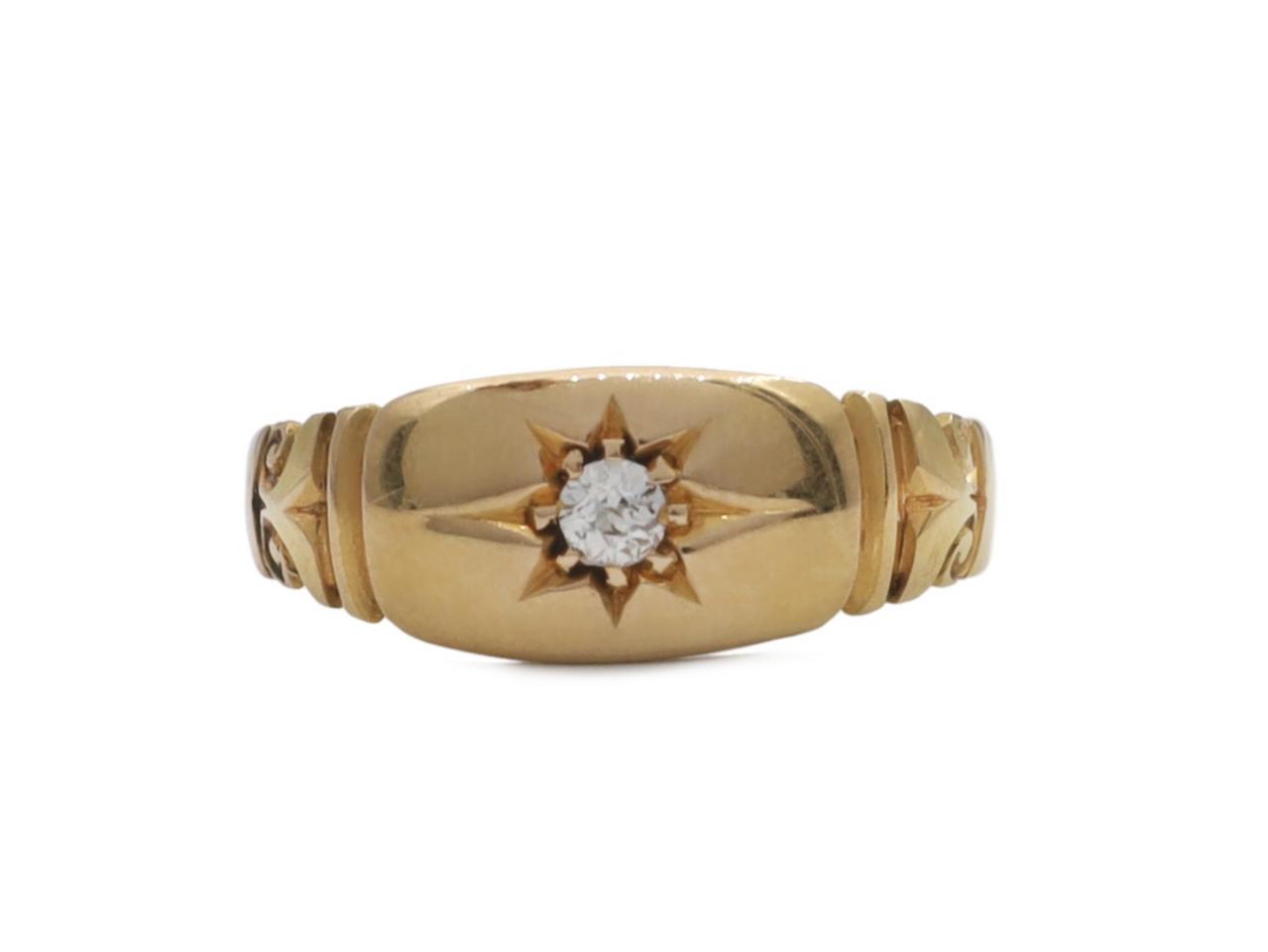 1895 diamond gypsy carved plaque ring in 18kt yellow gold. Centrally set with a round old cut diamond in an eight rayed star setting, set in a bombe polished plaque, flanked by carved scrolled terminals which smooth to a solid shank. Hallmarked 18kt gold, Chester, 1895.