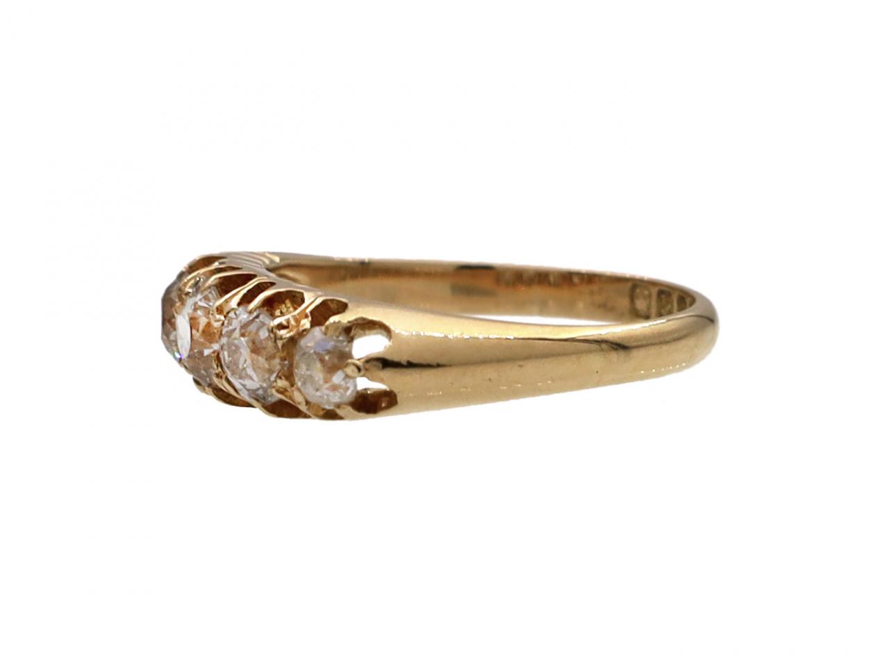 1897 Old Mine cut diamond five stone ring in 18kt yellow gold. Set with five cushion shape Old Mine cut diamonds in claw settings, to a graduating five stone design with curving claws, pierced gallery and trumpeting shoulders which flow to a solid shank. Hallmarked 18kt gold, London, 1897.