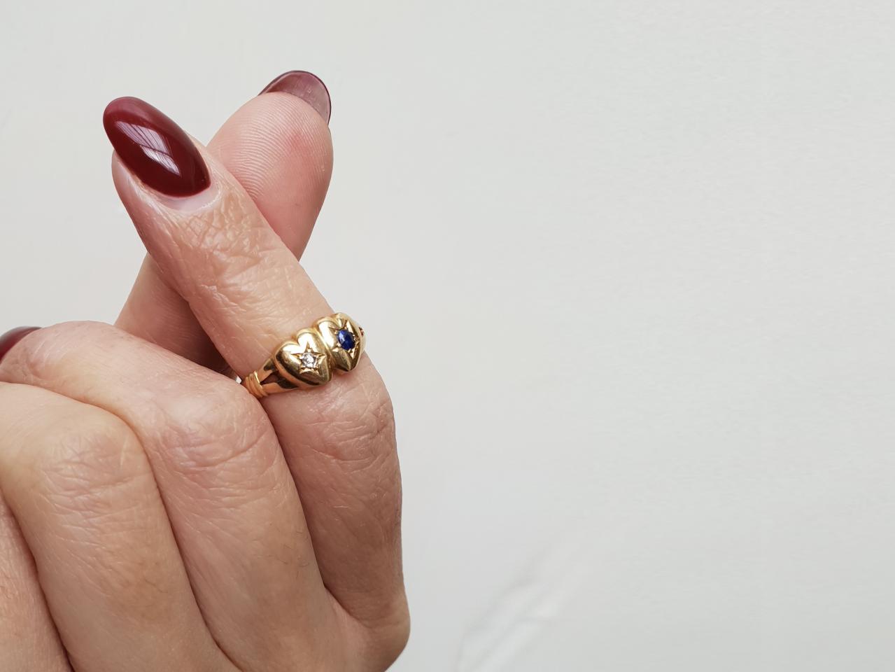 1899 double heart diamond and sapphire ring in 18kt yellow gold. Centred with two puffy heart motifs, one centred with a cushion shape old cut diamond in a five rayed star setting, the other centred with a cushion shape mixed cut sapphire in a five rayed star setting, flanked to either side with split trumpeting shoulders terminating to tri-ribbed details before smoothing to a solid shank. Hallmarked 18kt gold, Chester, 1899.