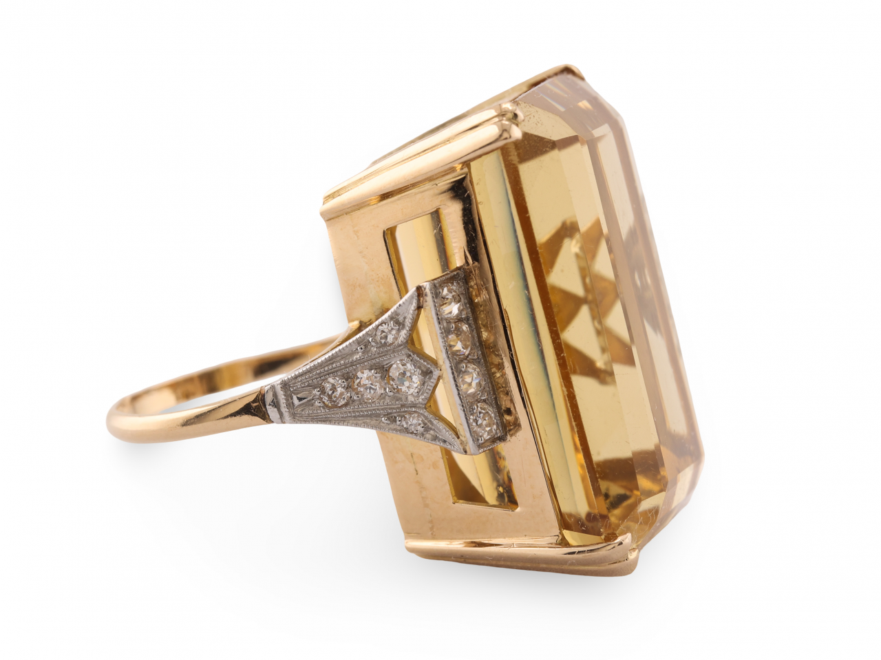 A spectacular cocktail ring set with a large emerald-cut citrine of approximately 50 carats in an 18ct yellow gold and platinum mount. The citrine displays a rich golden honey colour with excellent transparency and is held in place by six yellow gold claw prongs.