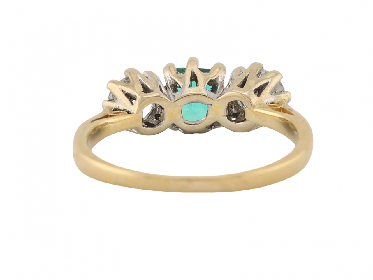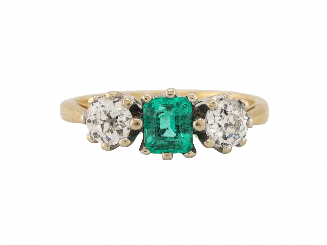 Flanking the emerald are two substantial old European cut diamonds, each estimated at 0.50ct, set in white metal claws that enhance their brightness against the yellow gold shank. These are proper period diamonds with the chunky, characterful faceting that marks them as genuine antique cuts. They have real presence and fire, catching the light with a warmth and depth that modern round brilliants simply cannot replicate.