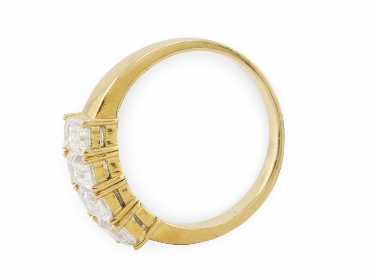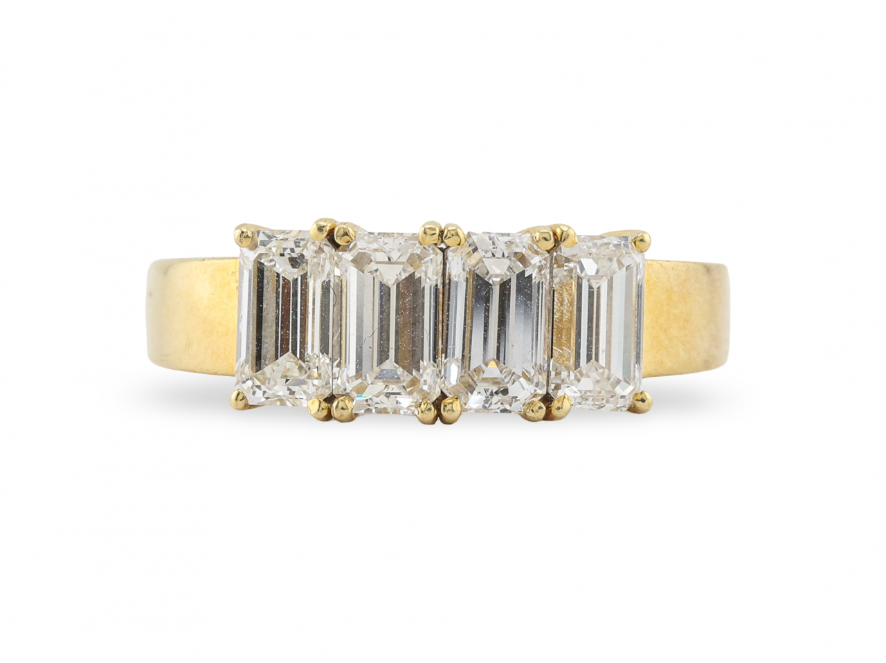 A five stone diamond ring featuring five matching emerald cut diamonds set in 18ct yellow gold. The stones are held in shared claw settings that allow maximum light to enter, creating those distinctive hall-of-mirrors flashes that make emerald cuts so appealing. Total diamond weight is estimated at 2.4 carats with G colour and SI1 clarity.