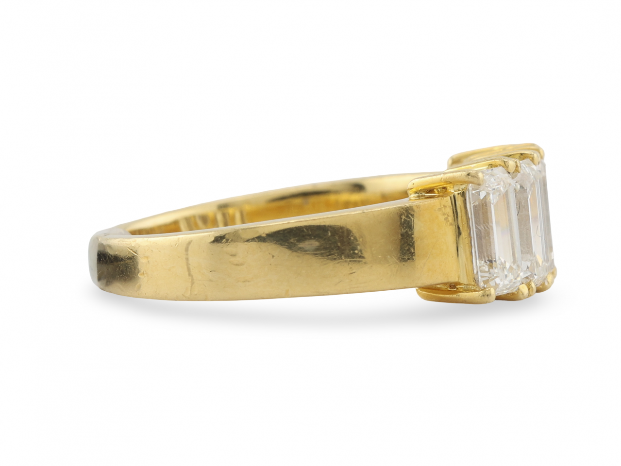 The substantial yellow gold band has a flat profile that complements the geometric lines of the emerald cuts. This is a confident, contemporary design that makes a statement without being flashy. It works equally well as an engagement ring or a right-hand ring for someone who appreciates clean, architectural jewellery.