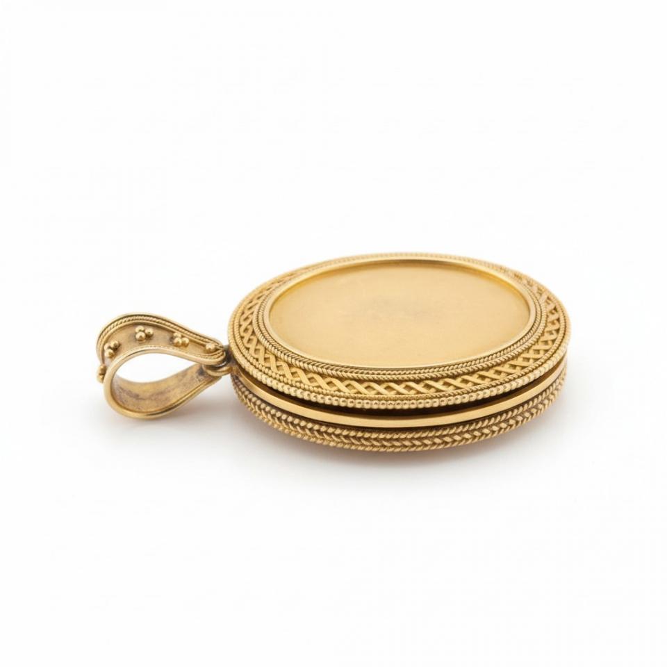 An antique 18k yellow gold oval locket of substantial weight and quality, crafted with detailed engraved borders and beaded edging. The locket opens to reveal its original interior, housing a sepia portrait on one side and traditional hairwork on the other. The wide bail is decorated with applied gold beadwork. The piece weighs 31 grams and has been preserved with its original inner frames intact. A significant antique locket suitable as a wearable keepsake or collector’s item.