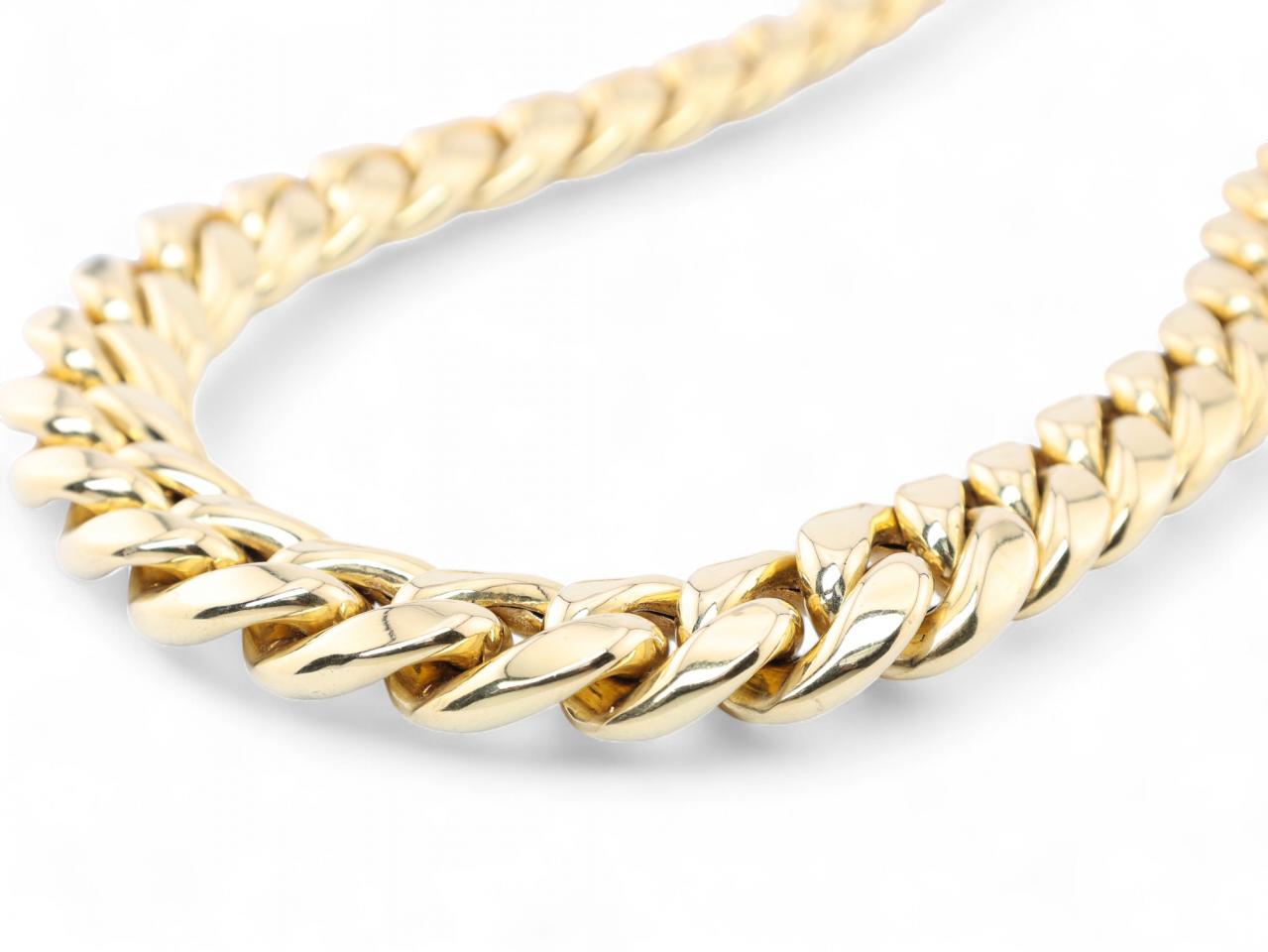 A substantial 18kt yellow gold necklace composed of solid flat curb links, measuring 46cm in length. The necklace weighs approximately 84 grams. Fitted with a concealed box clasp and figure-of-eight safety catch.