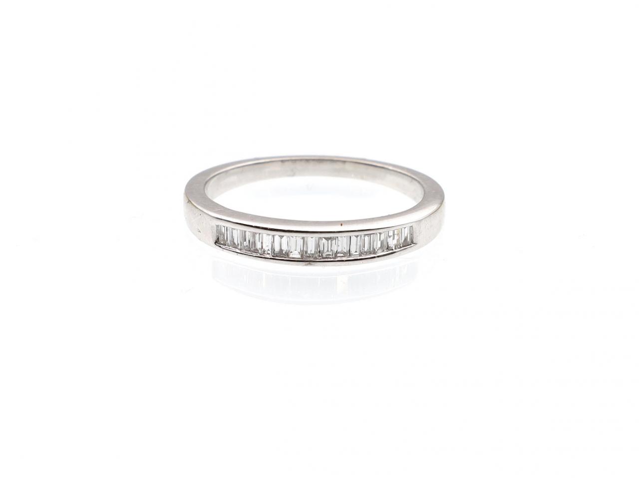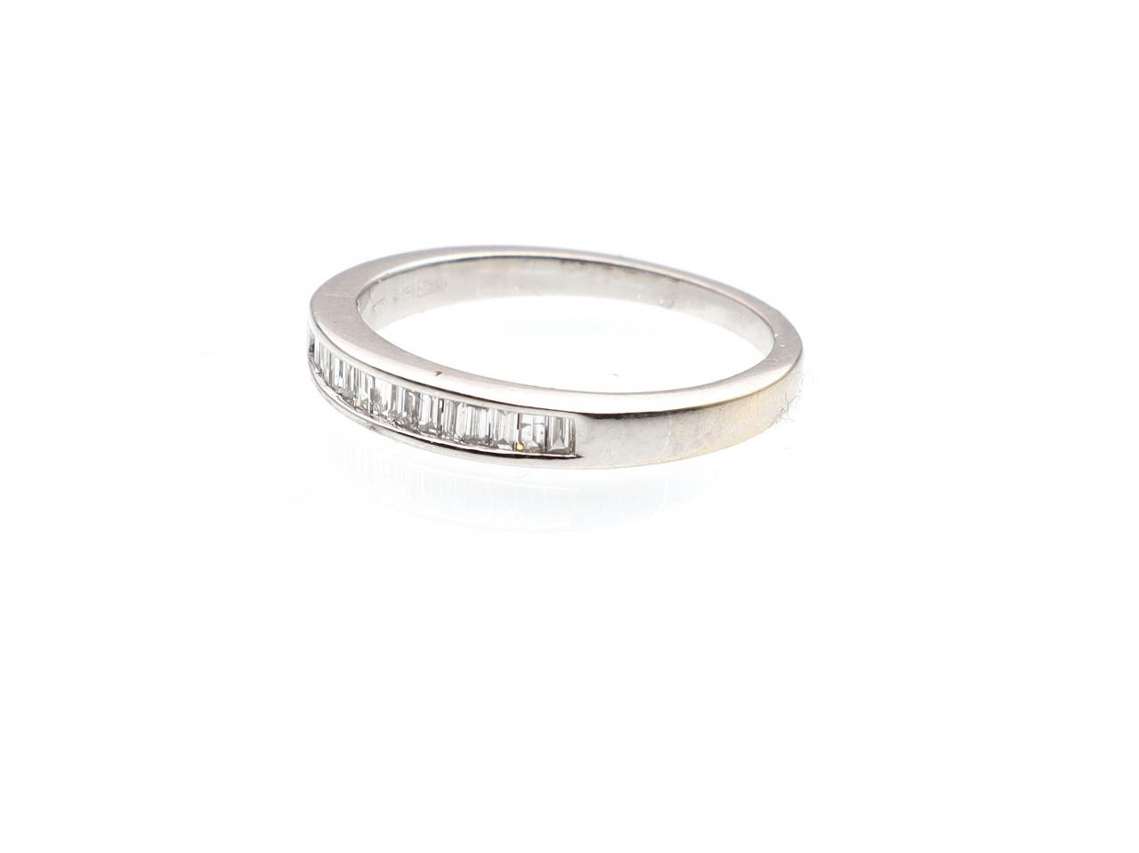 18kt white gold half eternity set with baguette cut diamonds. Set horizontally with rectangular baguette cut diamonds in channel settings which terminate to a solid shank. Marked 18kt gold.