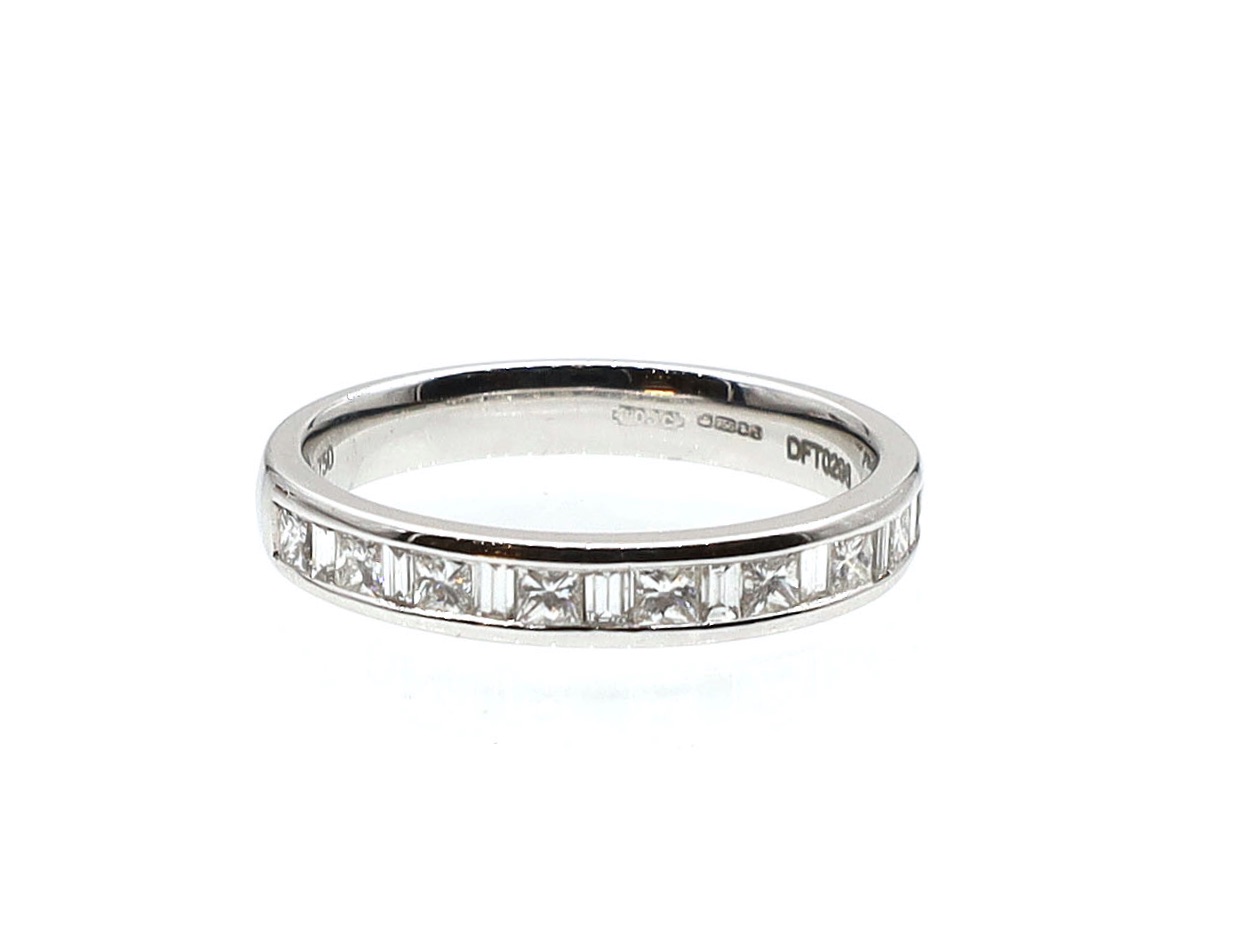 18kt white gold mixed step cut diamond half eternity ring. Set with alternating rectangular baguette cut and square princess cut diamonds in channel settings, terminating to a solid shank. Estimated total diamond weight 0.51cts. Hallmarked 18kt gold.