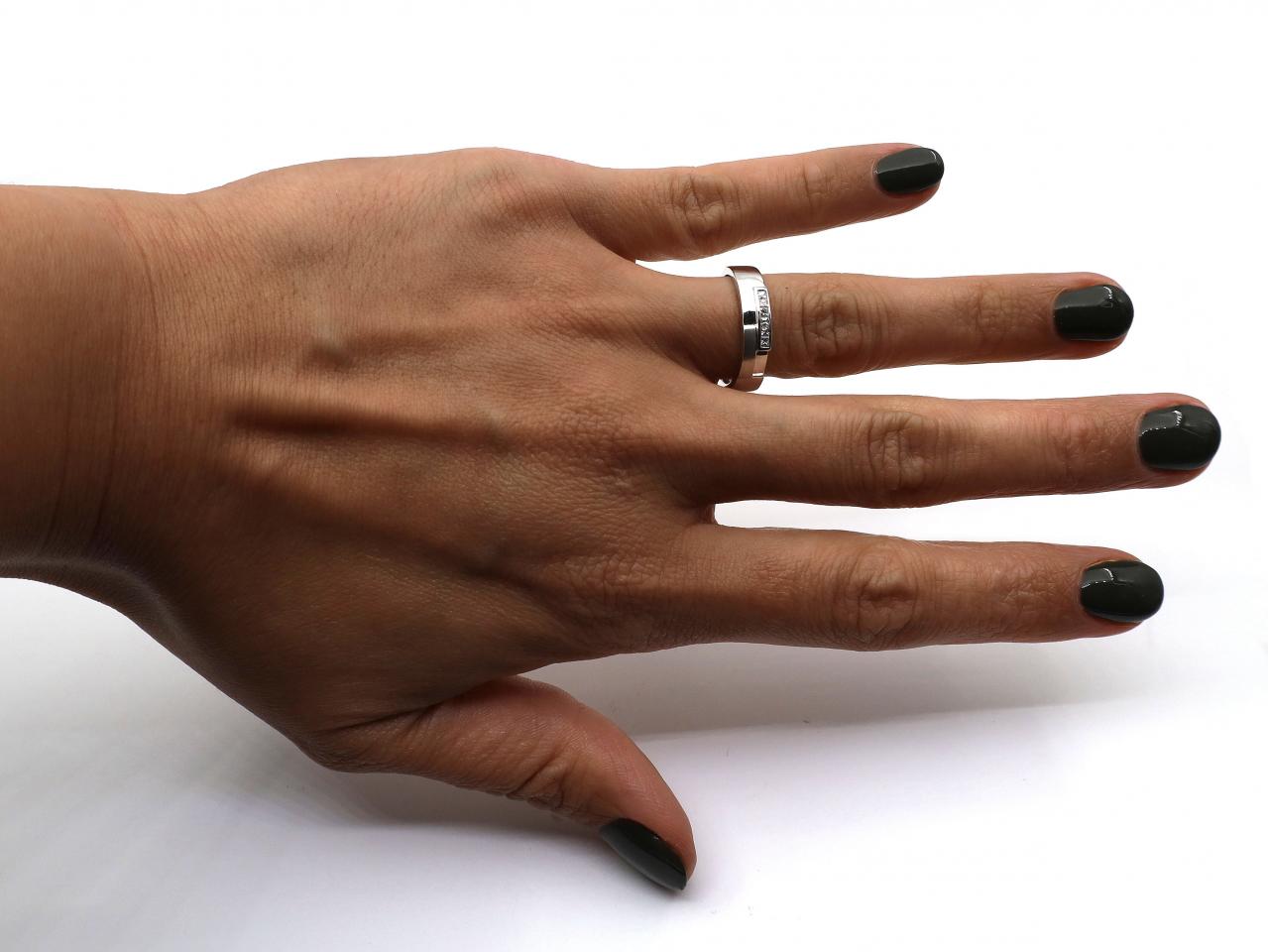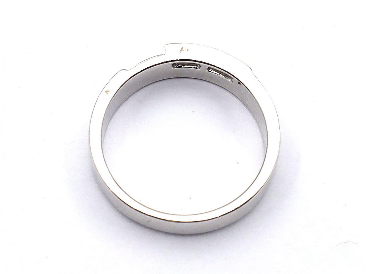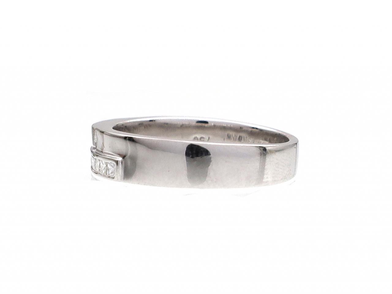 18kt white gold square wedding ring with princess cut diamonds. A square wedding band decorated to the front with four linear panels, two incised, one with a matte finish and one set with six square princess cut diamonds in channel settings. Hallmarked 18kt gold.