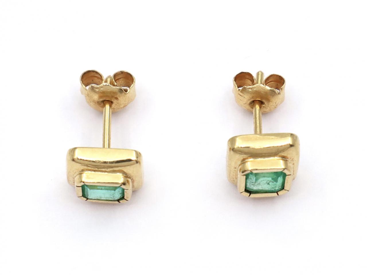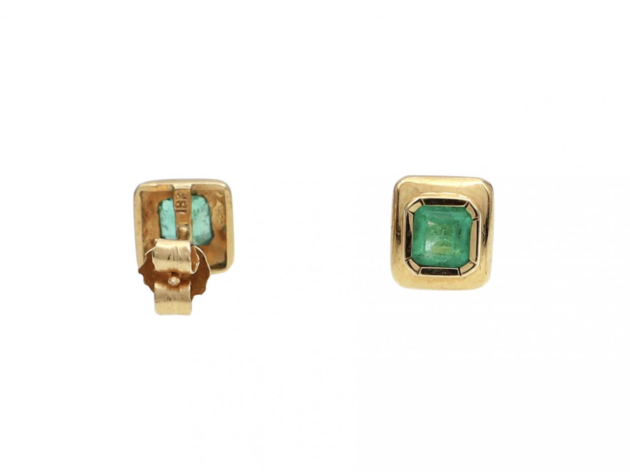 18kt yellow gold and emerald stud earrings. A matching pair of earrings, each set with a square step cut emerald in a rubover setting, bordered with a chunky polished frame and fitted to reverse with a secure post and butterfly. Marked 18kt gold.