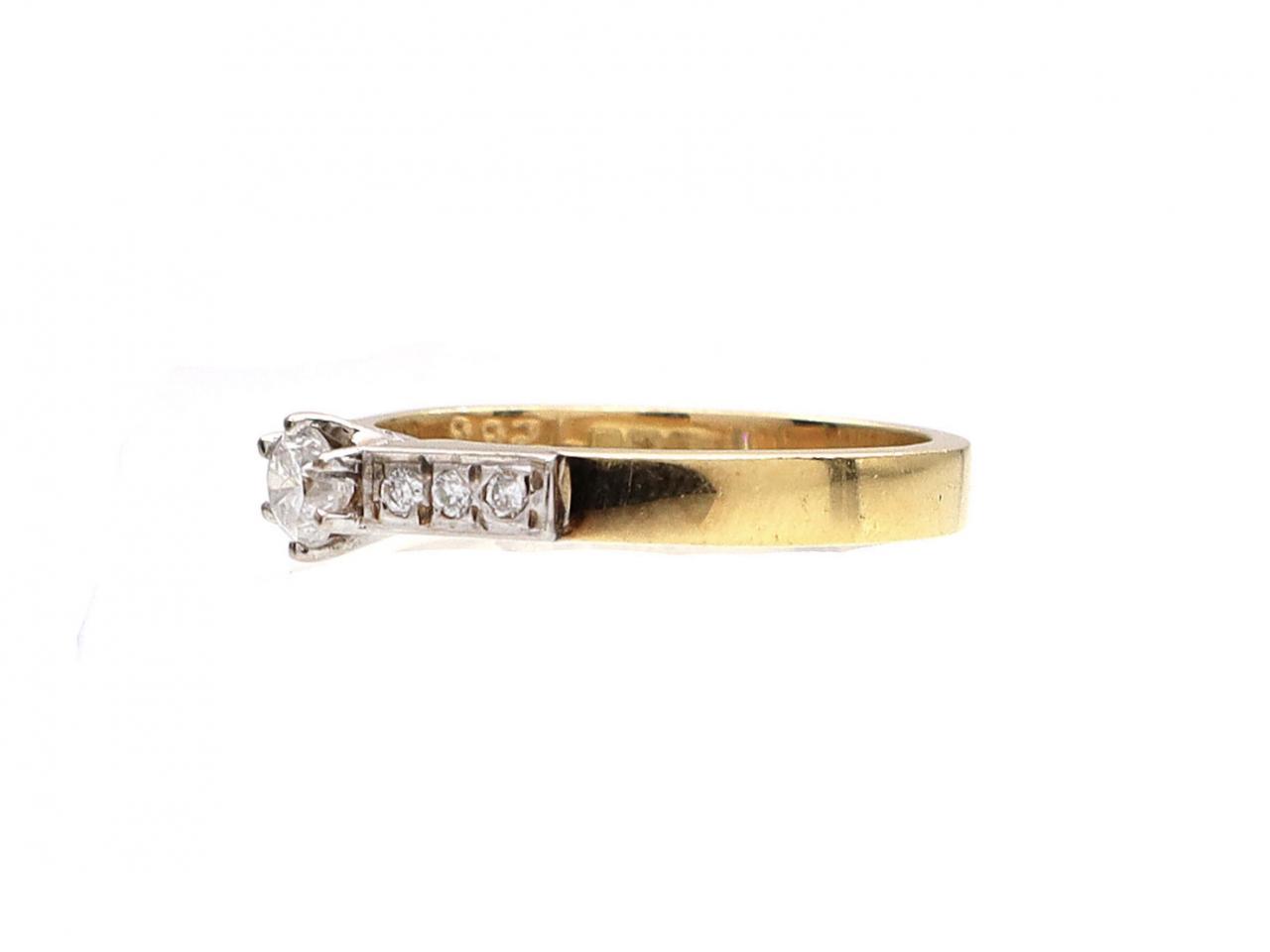 18kt yellow gold diamond solitaire engagement ring. Set with a round brilliant cut diamond in a claw setting, set to either side with six round brilliant cut diamonds in grain settings, steping down to a solid shank. Estimated total diamond weight 0.25cts. Hallmarked 18kt gold, Dublin.