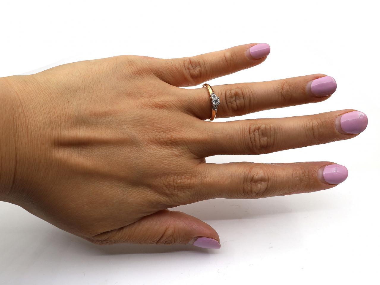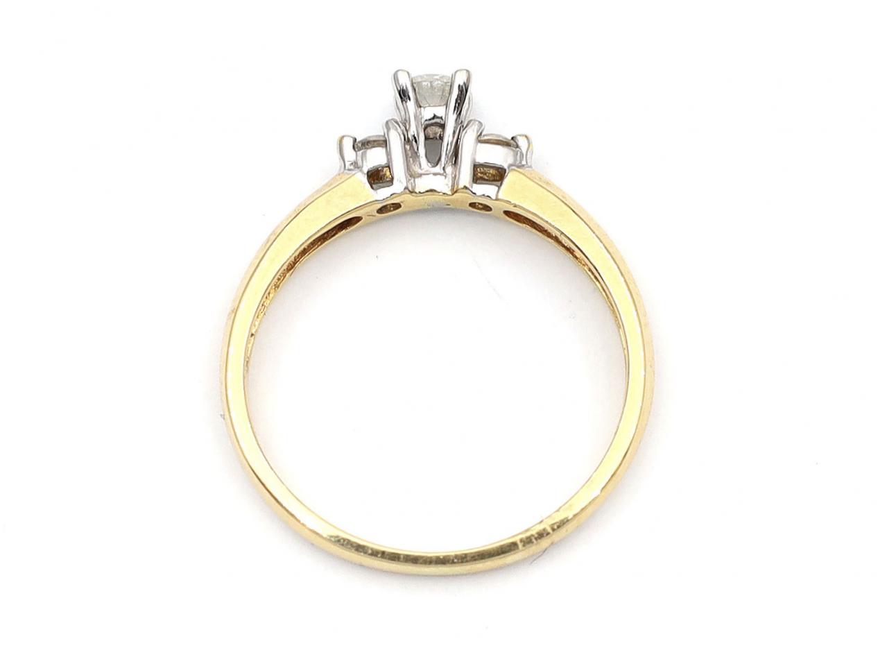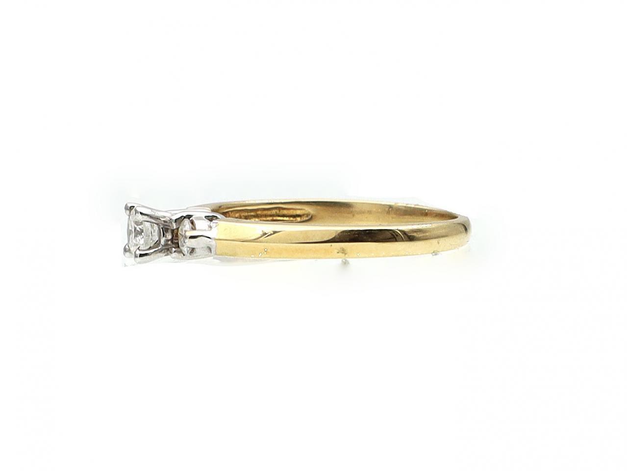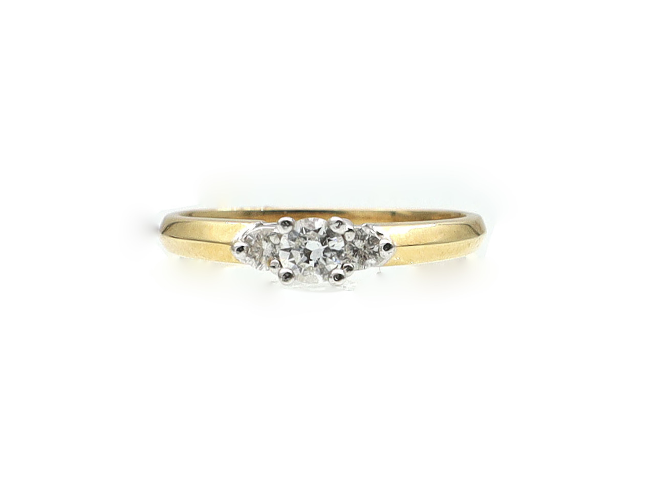 18kt yellow gold flanked diamond solitaire engagement ring. Centred with a raised round brilliant cut diamond in four claw setting, set to either side with two round brilliant cut diamonds in claw settings, further flanked by champfered shoulders which curve to a solid shank. Marked 18kt gold.