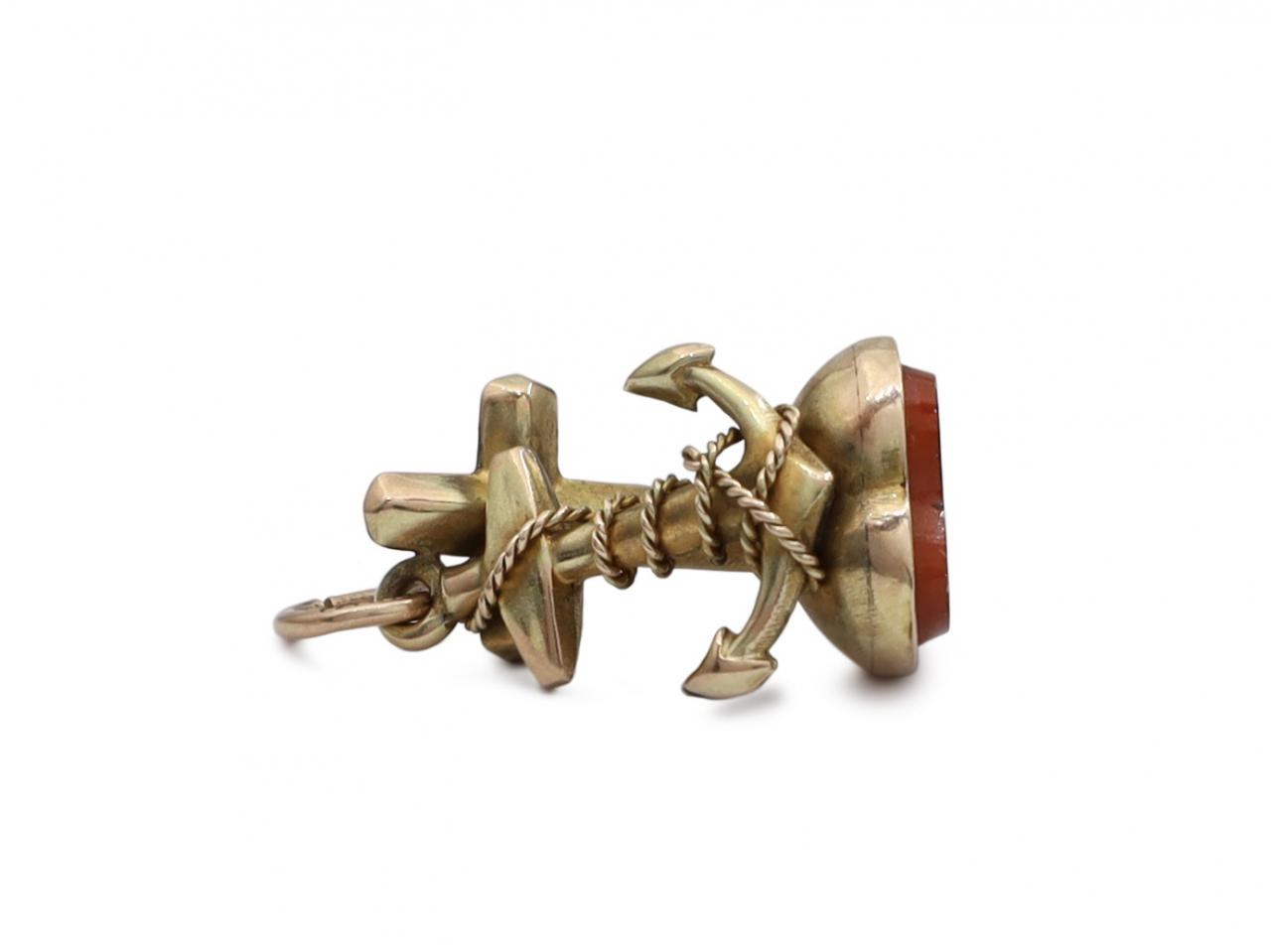 1900 antique carnelian faith, hope and charity fob in 9kt yellow gold by William Hair Haseler. An antique fob consisting of three interlocking motifs, a heart carnelian tablet, an anchor with a twisted rope and a cross, fitted to top with a circular bale. Hallmarked 9kt gold, Birmingham, 1900. Maker's mark for William Hair Haseler.