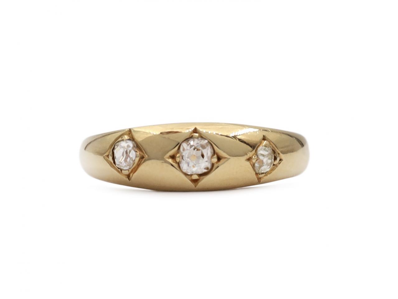 1902 diamond three stone gypsy ring in 18kt yellow gold. Set across the finger with three cushion shape Old Mine cut diamonds in flush diamond shape settings, to an inset three stone ring with polished surround and integrated shoulders which flow to a solid shank. Hallmarked 18kt gold, London, 1902.