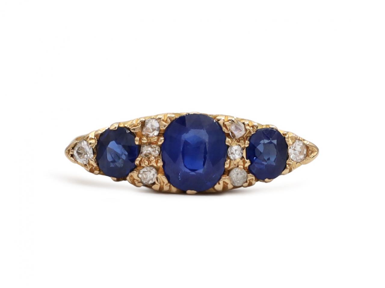 1902 sapphire three stone carved ring in 18kt yellow gold. Set across the finger with three cushion shape mixed cut sapphires in fine claw settings, each sapphire alternating with vertical rows of old cut diamonds in grain settings, to a navette design with bespoke claws, carved open gallery and shoulders that flow to a solid shank. Hallmarked 18kt gold, Birmingham, 1902.