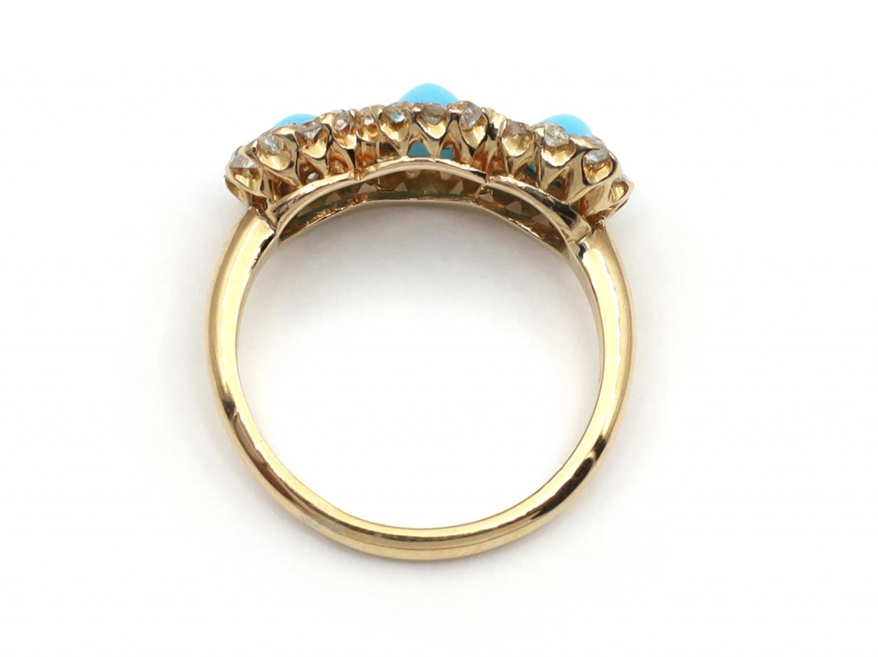 1905 turquoise and diamond three stone cluster ring in 18kt yellow gold. Set across the finger with three oval cabochon turquoise in grain settings, each surrounded by Old Mine and rose cut diamonds in grain settings, to a fancy cluster ring with handcrafted settings, pierced gallery and flanked to either side with slightly trumpeting shoulders which smooth to a solid shank. Hallmarked 18kt gold, Chester, 1905.