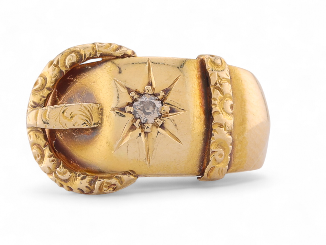 An Edwardian buckle ring set with a single old cut diamond, estimated weight 0.02ct. Hallmarked Chester, 1907. Mounted in 18kt yellow gold with engraved detail.