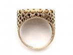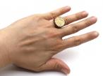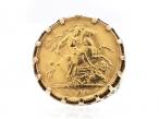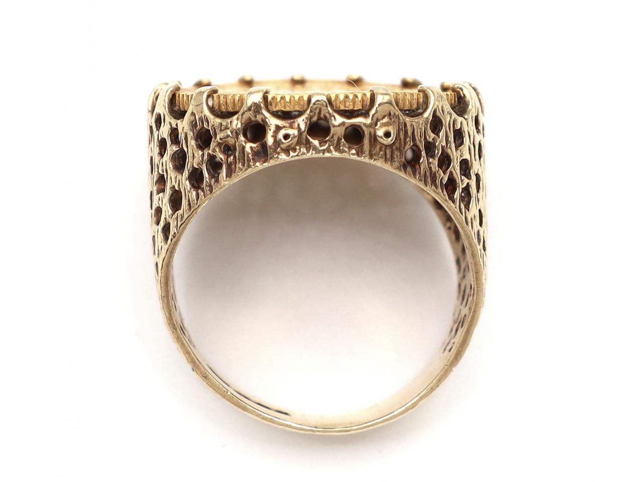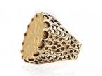 1908 half sovereign coin ring in 9kt yellow gold mount. A textured pierced open ring mount set with a 1908 half sovereign coin in a claw setting. Hallmarked 9kt gold.