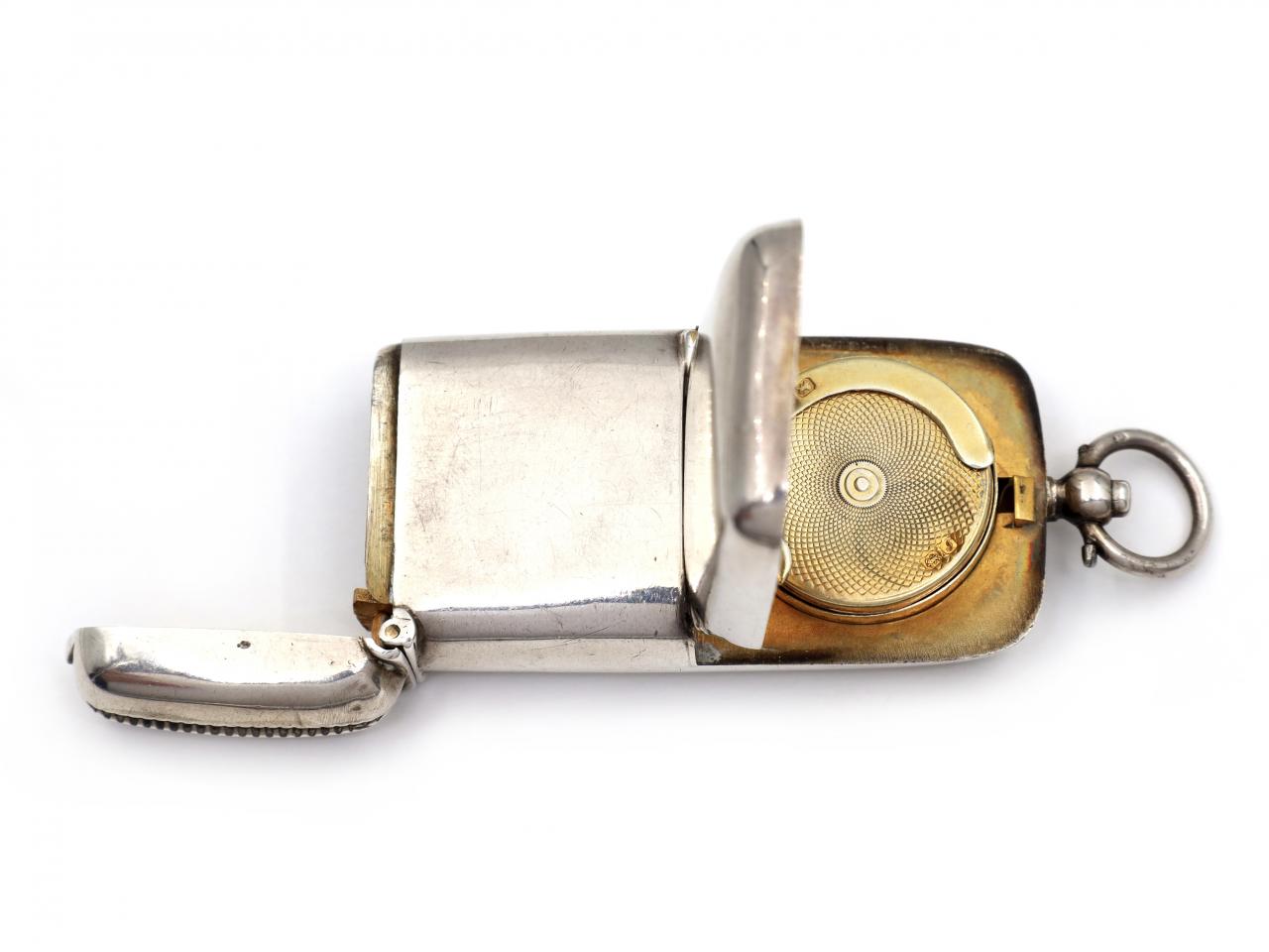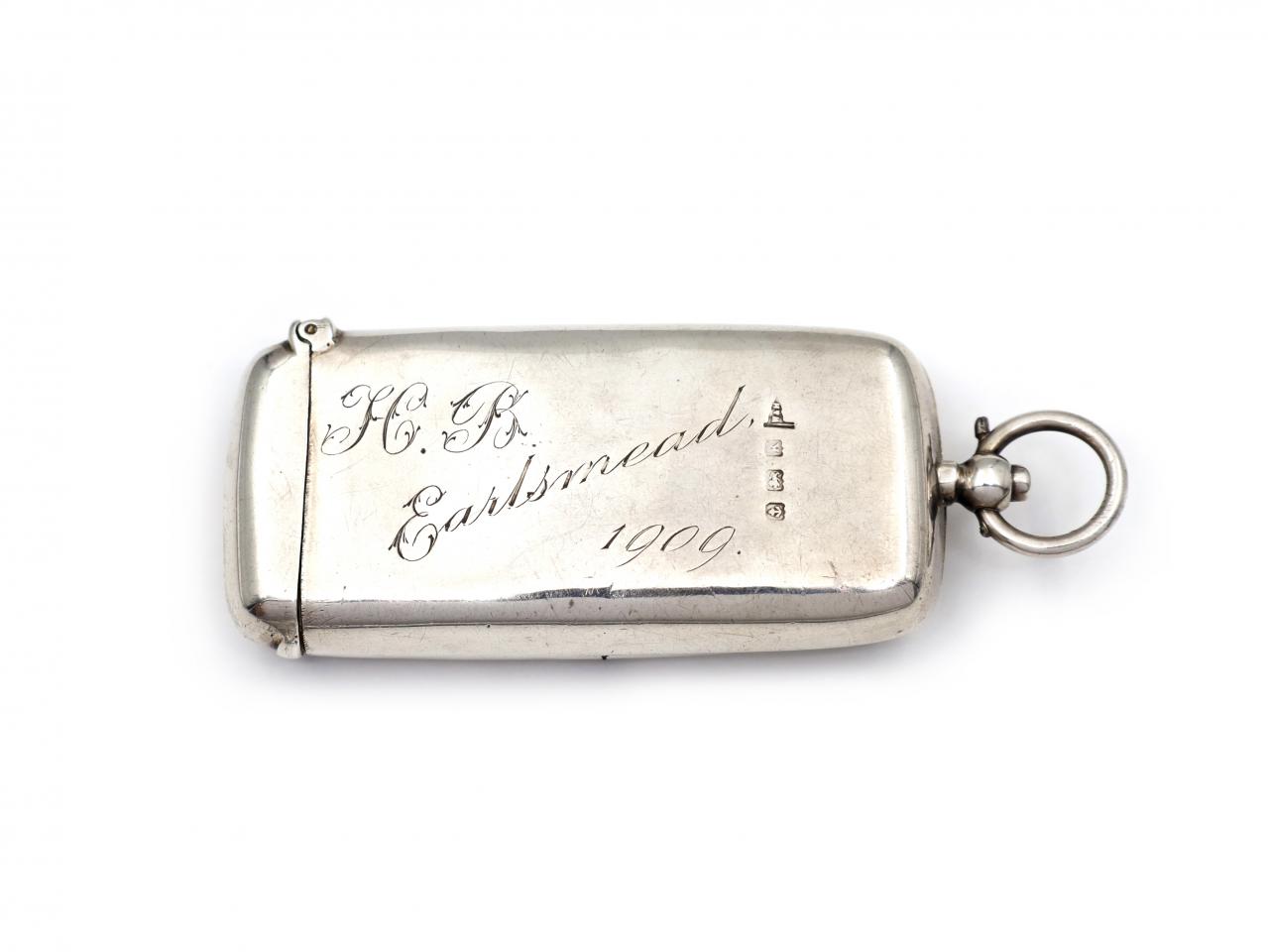 1909 sterling silver Sovereign holder and vesta case with engraved front and gold guilded interior. Hallmarked sterling silver, Birmingham.
