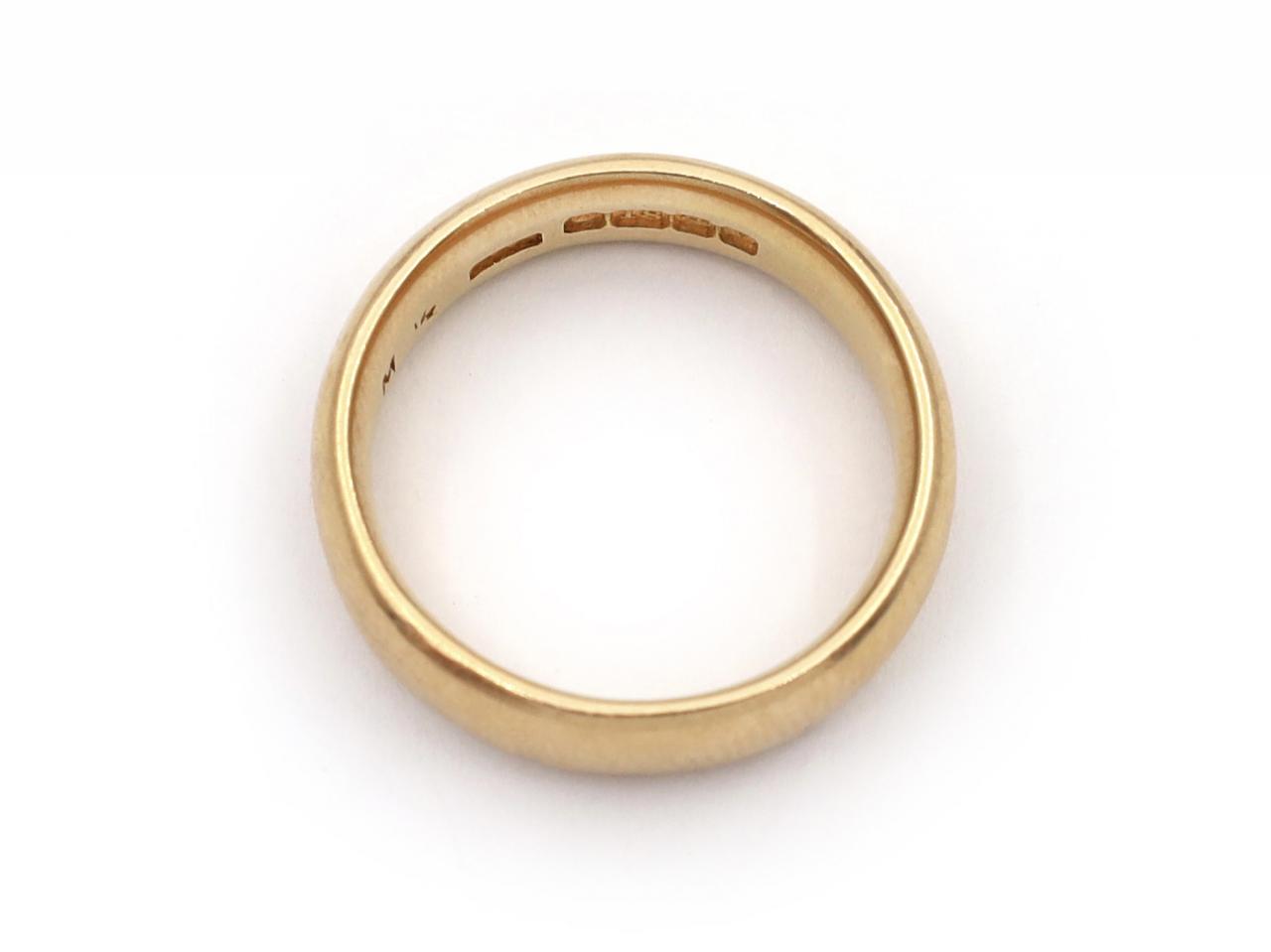 1919 comfort fit 4.75mm wedding ring in 22kt yellow gold. Hallmarked 22kt gold, Birmingham, 1919.