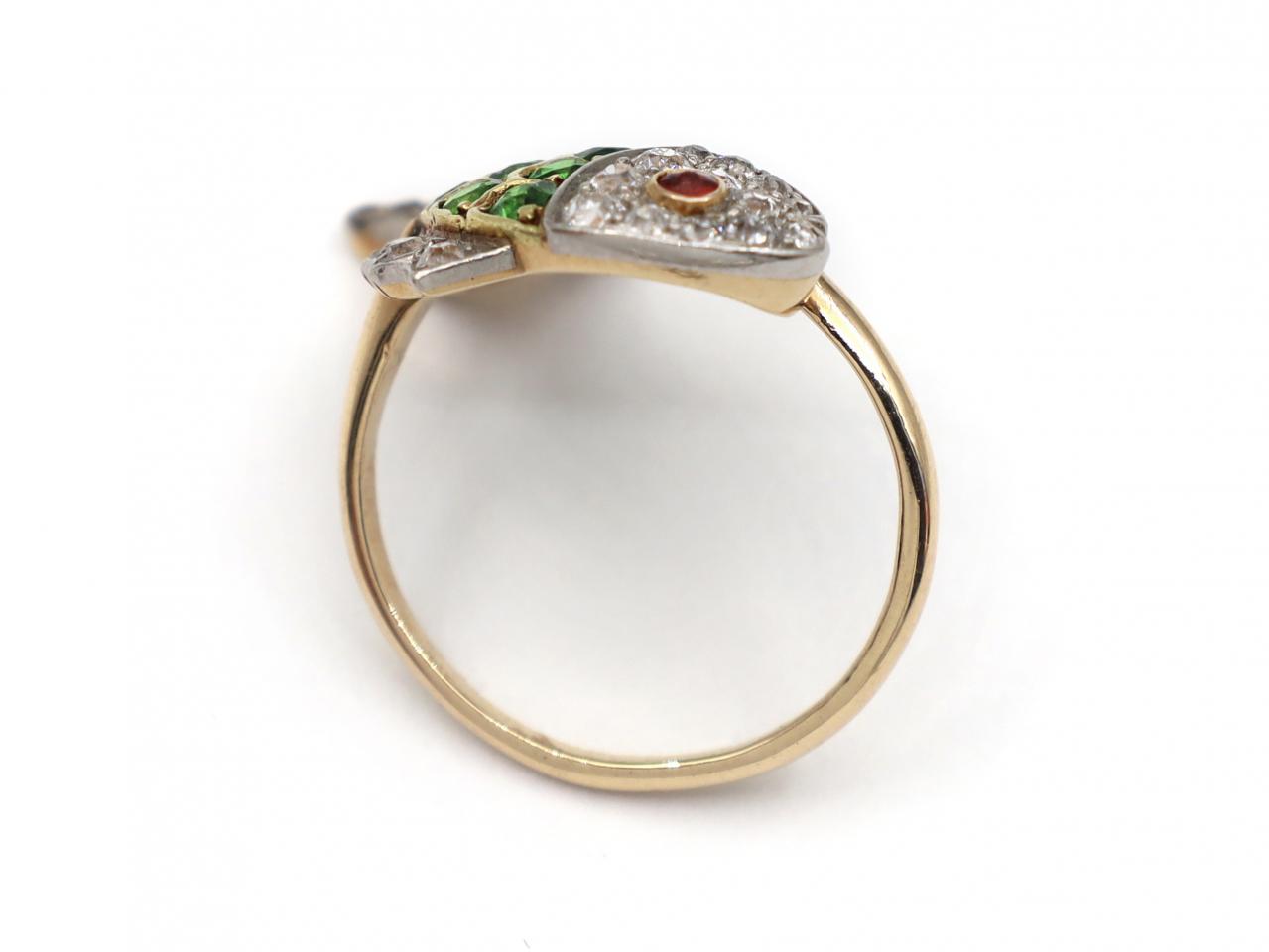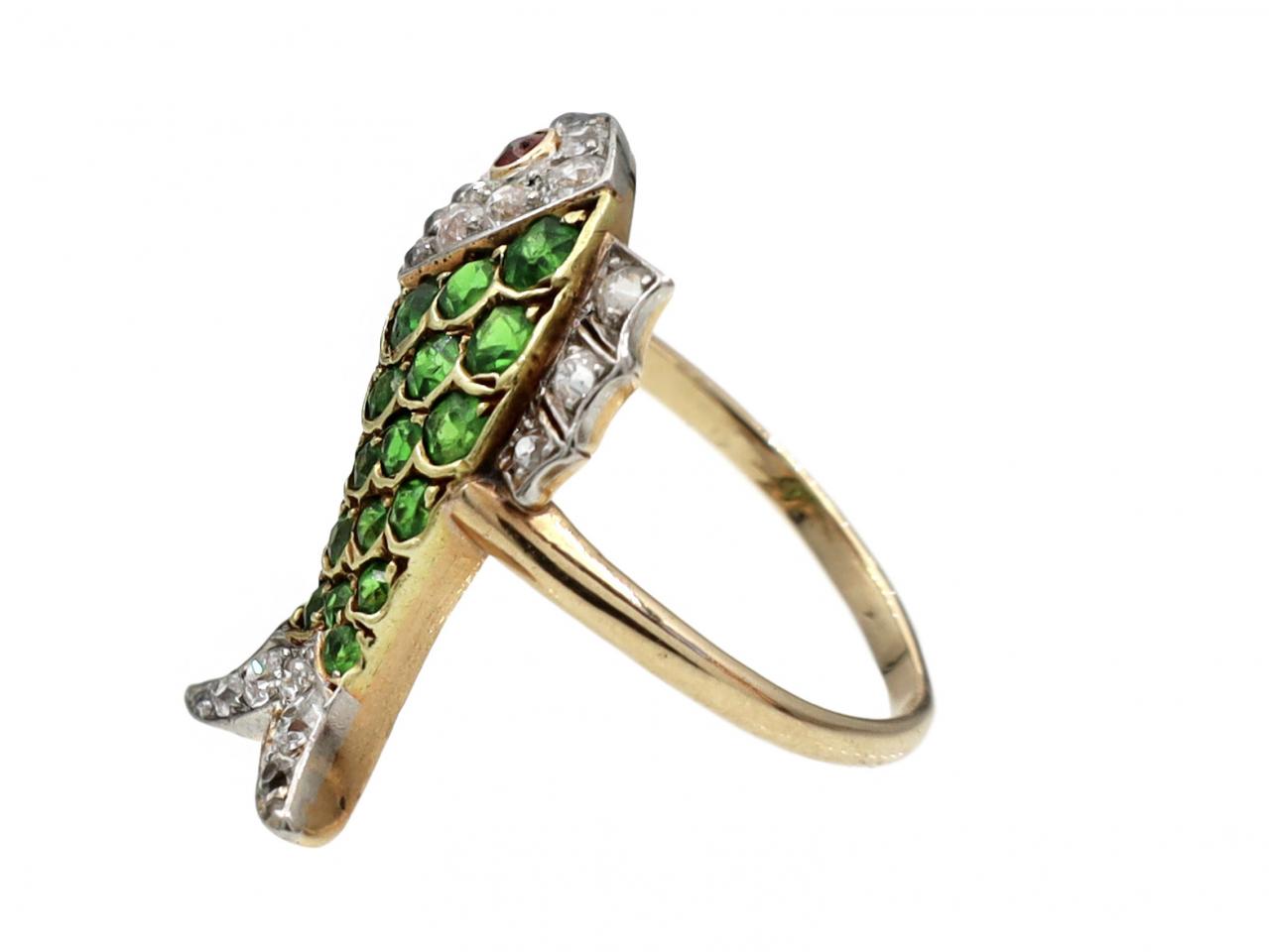 1920s demantoid garnet, diamond and ruby flying fish ring in platinum and 18kt yellow gold. A smooth curved cluster in the form of a fish with diamond set fins and head and round mixed cut demantoid garnets in yellow gold scale settings, further embellished with a round mixed cut ruby in a rubover setting.