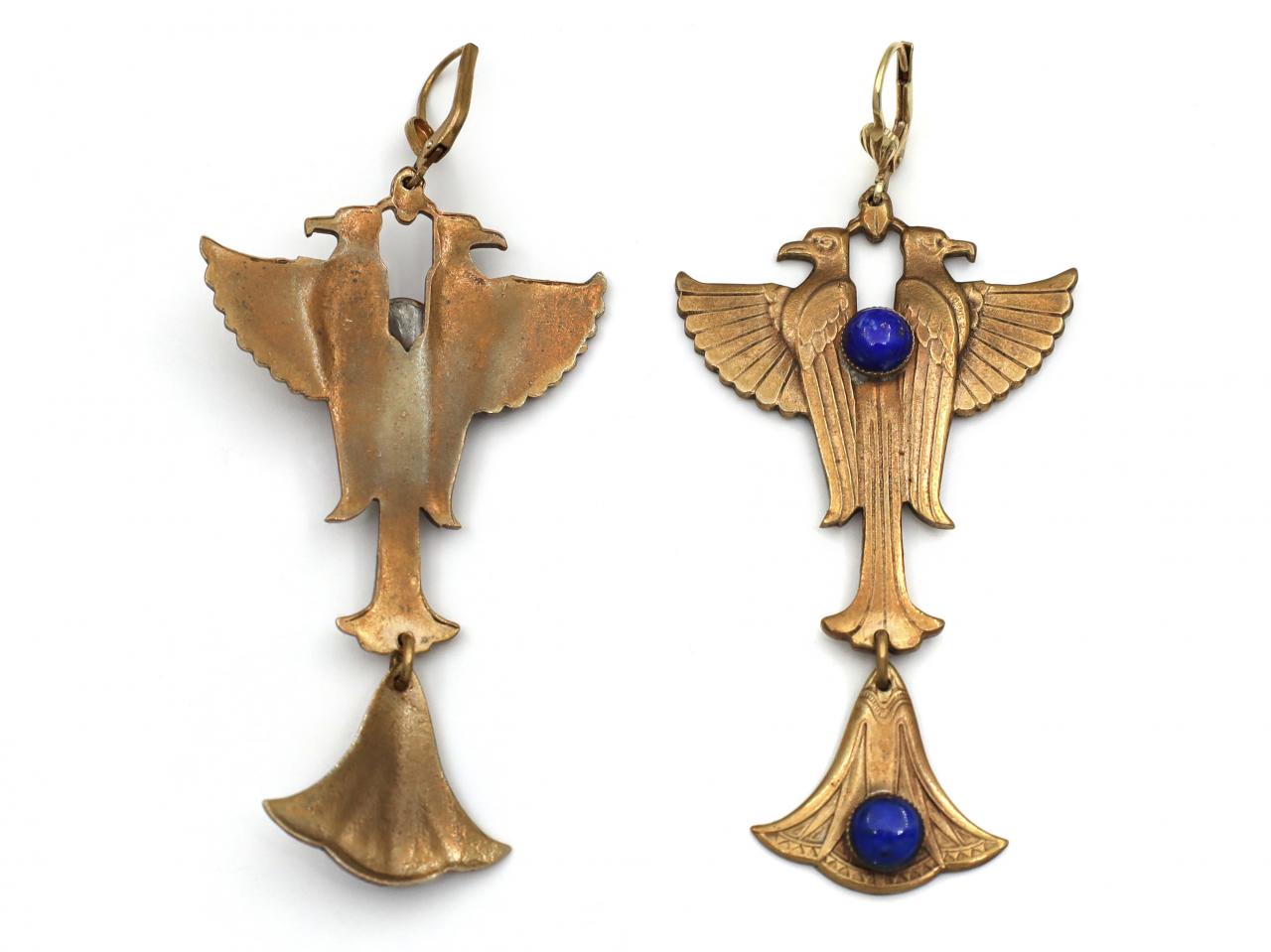 1920s Egyptian Revival lapis lazuli and plated steel falcon earrings. A Matching pair of earrings, each consisting of two falcons with one wing fanned centred with a round cabochon cut lapis lazuli in a rubover setting, suspending an articulated floral drop set with a round cabochon cut lapis lazuli in a rubover setting, fitted to top with a secure hinged hook.