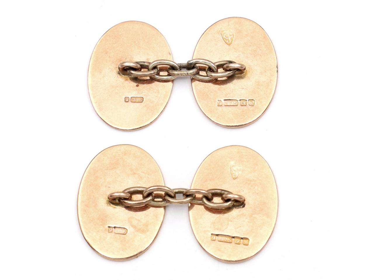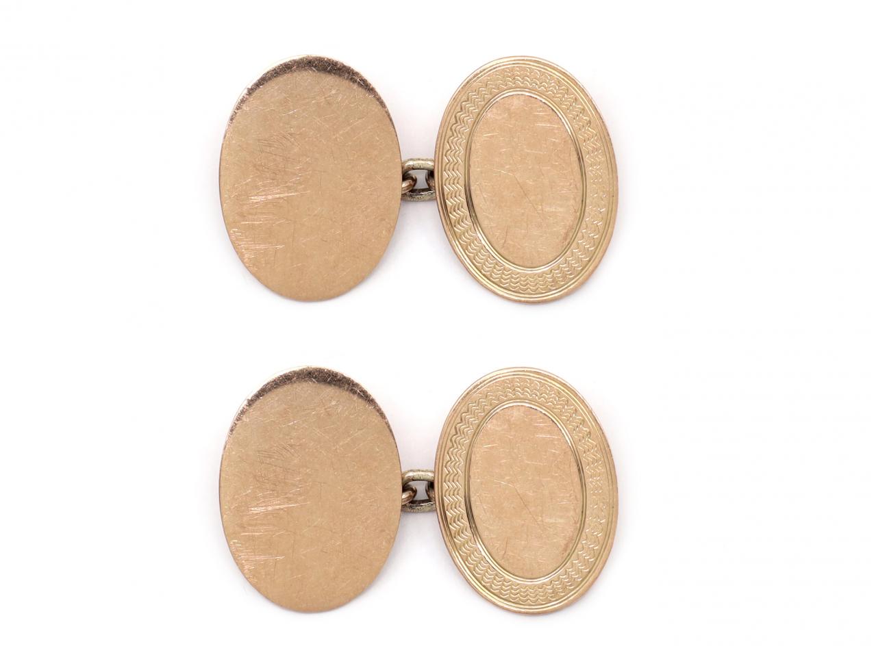 1922 oval 9kt rose gold cufflinks. A matching pair of cufflinks, each consisting of two oval plaques, the front plaque decorated with an etched border, fitted to reverse with a solid belcher chain connecting the back polish oval plaque. Hallmaked 9kt gold, Birmingham, 1922.