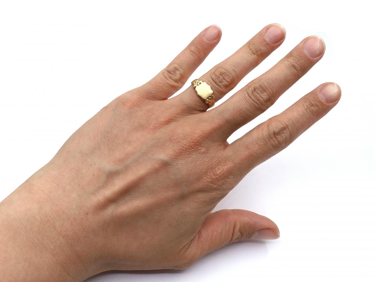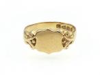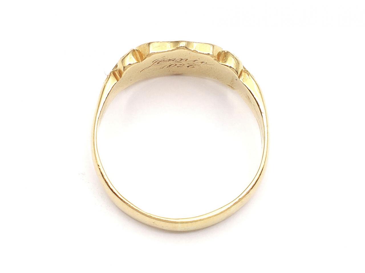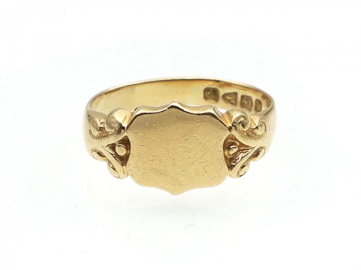 1925 shield signet ring in 18kt yellow gold. Centred with a polished gold plaque in the form of a shield, flanked to either side with elaborately carved scrolling shoulders which terminate to a solid shank. Engraved to the reverse of the plaque ' Jennie 1926' in script. Hallmarked 18kt gold, Chester, 1925.