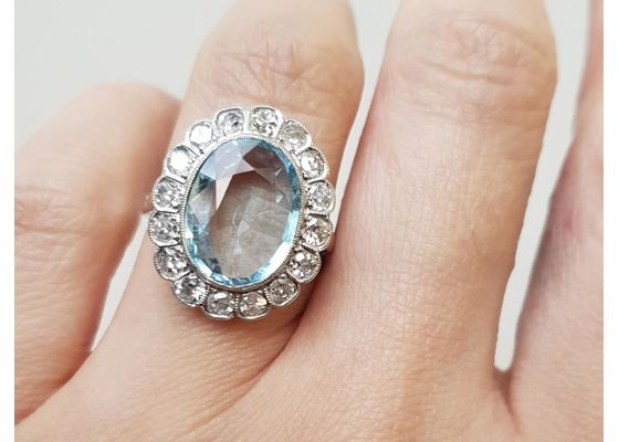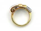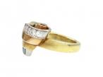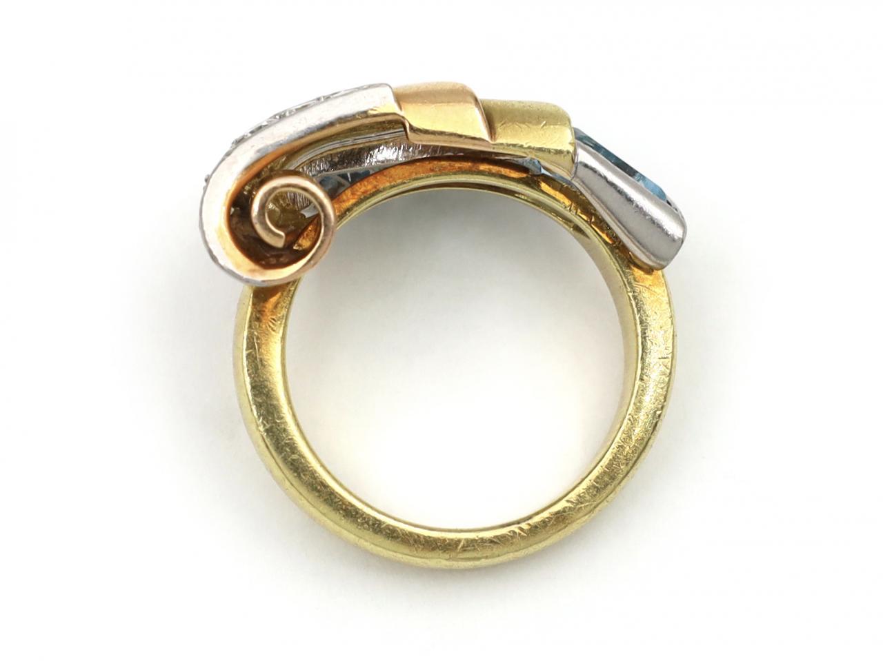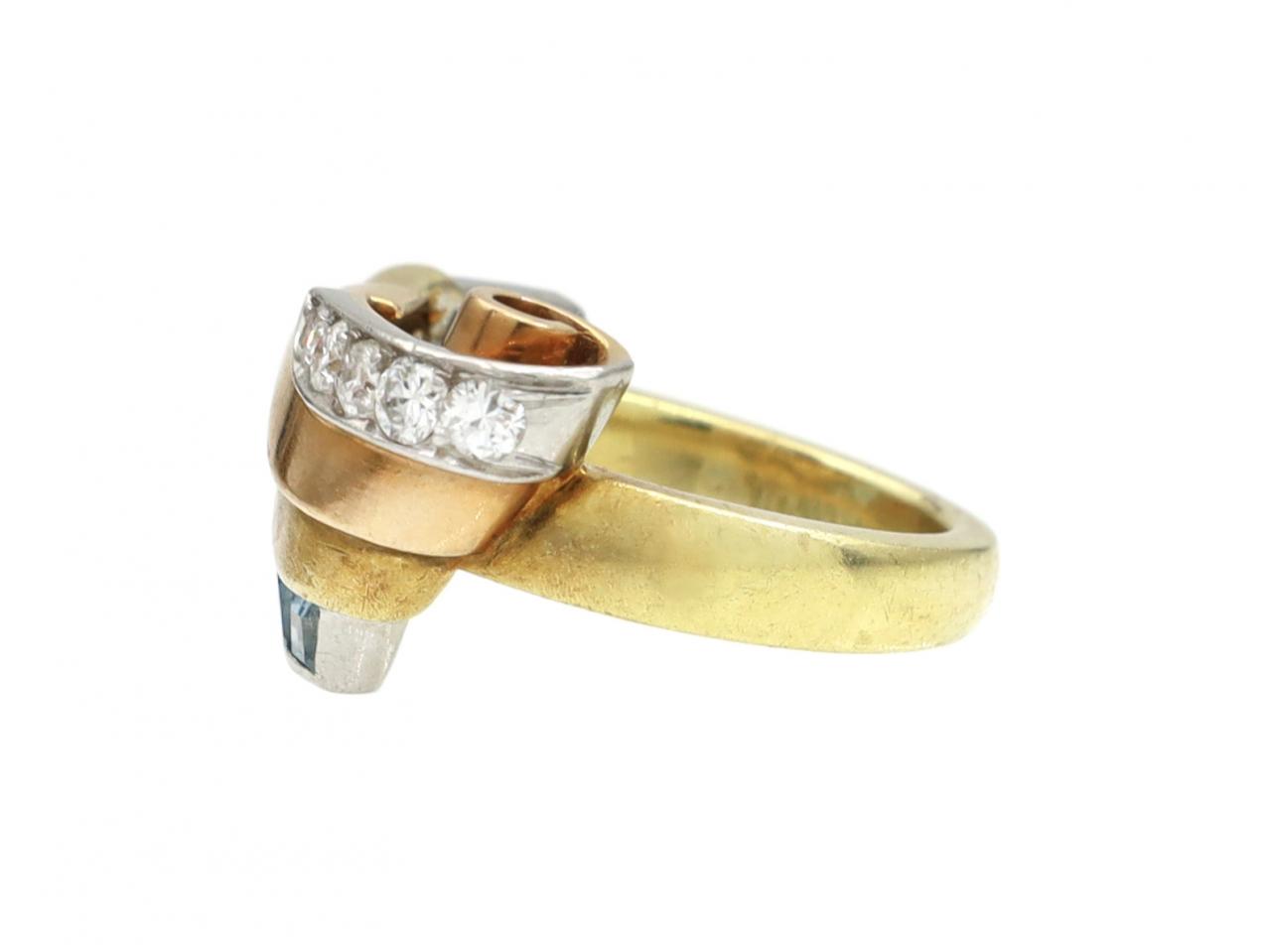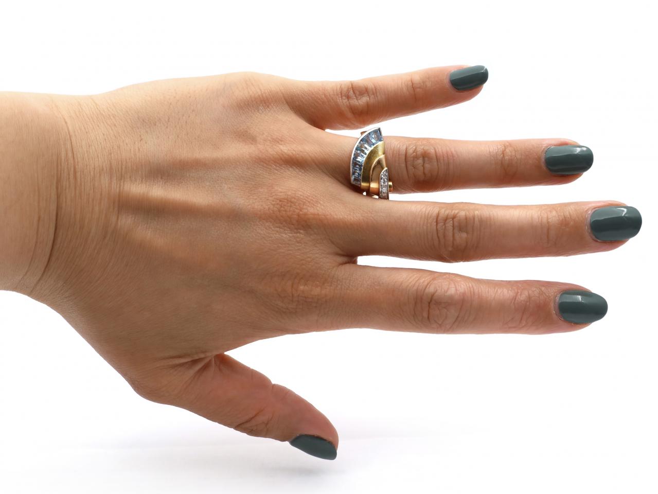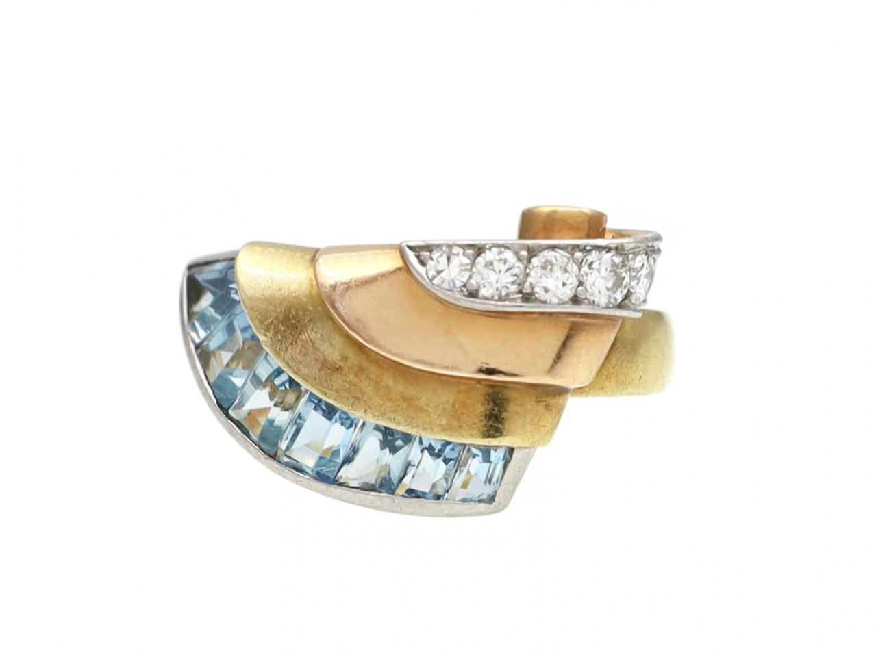 1930s diamond and aquamarine Egyptian revival wing ring in 18kt gold. A stylised angular wing motif set to top with a row of round brilliant cut diamonds in grain platinum settings, set with the bottom with a panel of graduating tapering baguette cut aquamarines in channel settings, to yellow and rose gold terraces, scrolling terminal and broad solid shank.