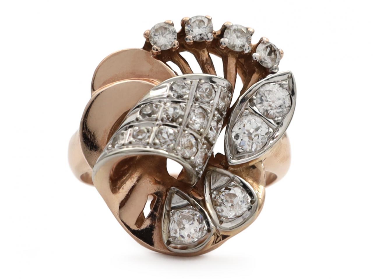 1940s diamond set floral cocktail ring in 18kt rose gold. Set with four round Old European cut diamonds in platinum collet settings, enhanced with a scroll of twelve round single cut diamonds in square grain settings, further highlighted by four round brilliant cut diamonds in four claw settings, to an openwork cocktail ring with a three-dimensional design, flanked to either side with broad shoulders which smooth to a solid shank.