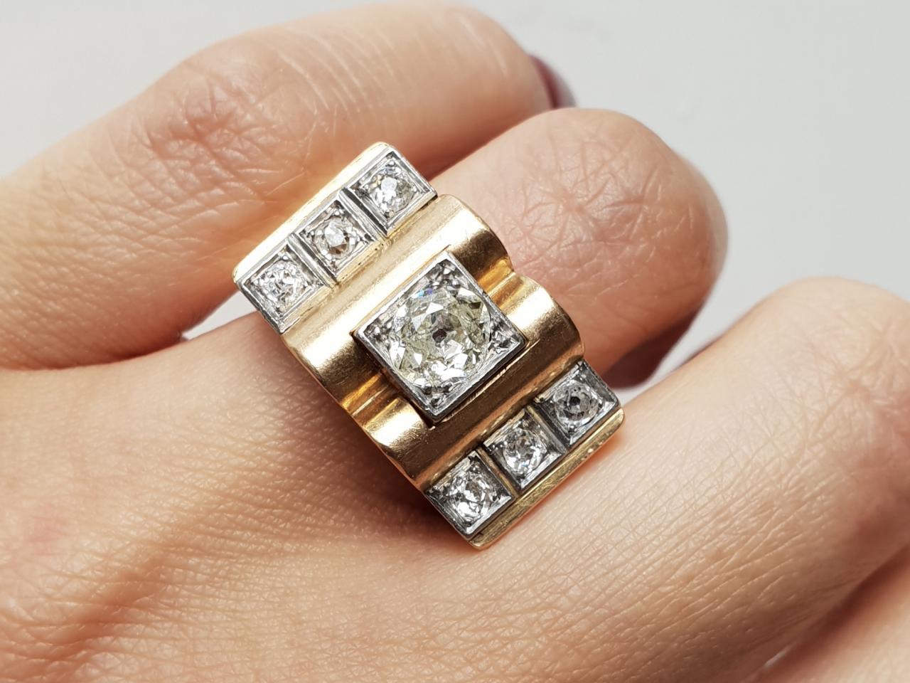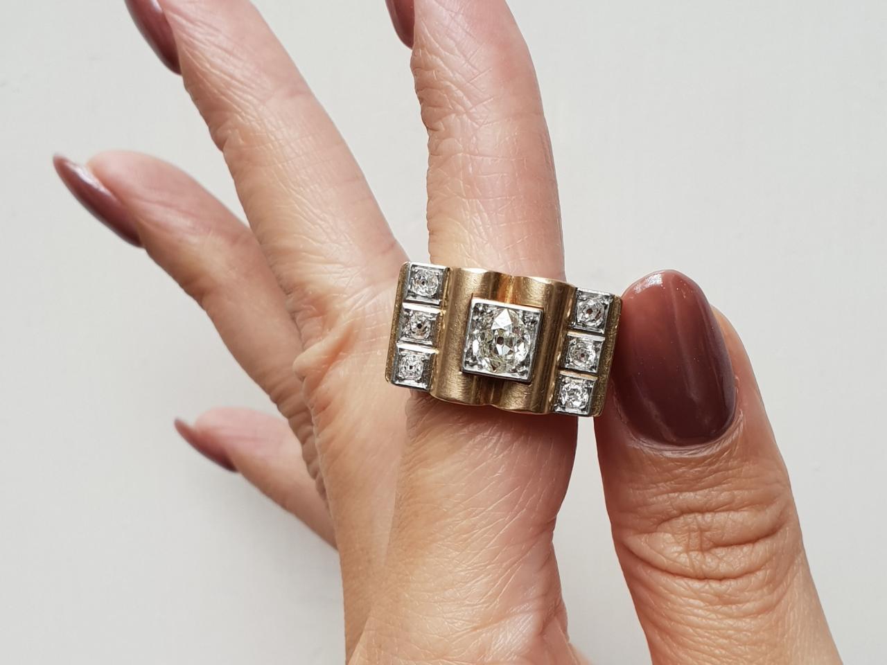 1940s diamond set tank ring in 18kt yellow gold. Centred with an estimated 0.70ct cushion shape Old Mine cut diamond in a platinum square collet decorated to the broad shoulders with six vertically set cushion shape Old Mine cut diamonds in platinum square collets, to a chunky, three-dimensional plaque, with curved raised terminals, polished gallery and integrated broad shoulders which smooth and taper to a solid shank.