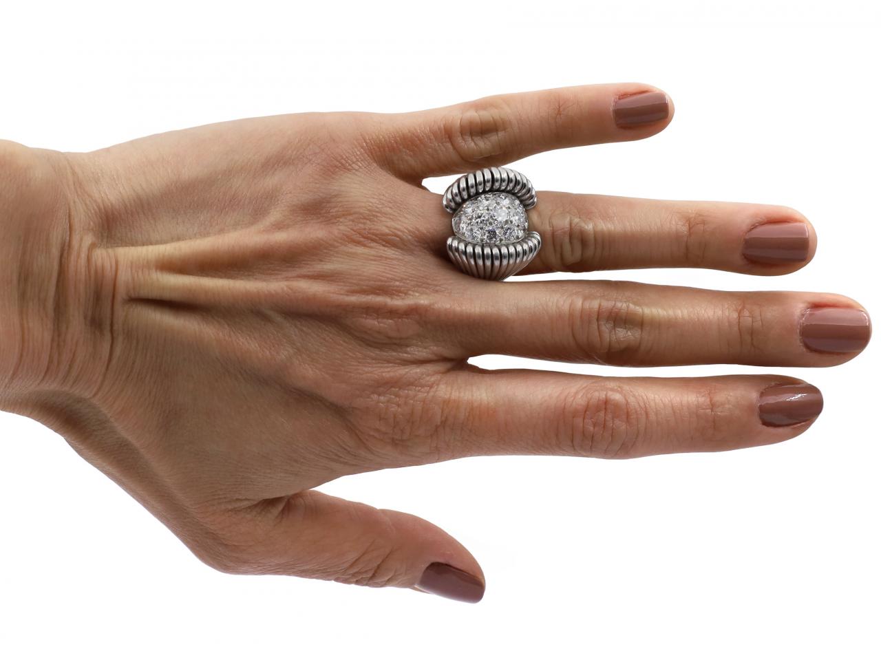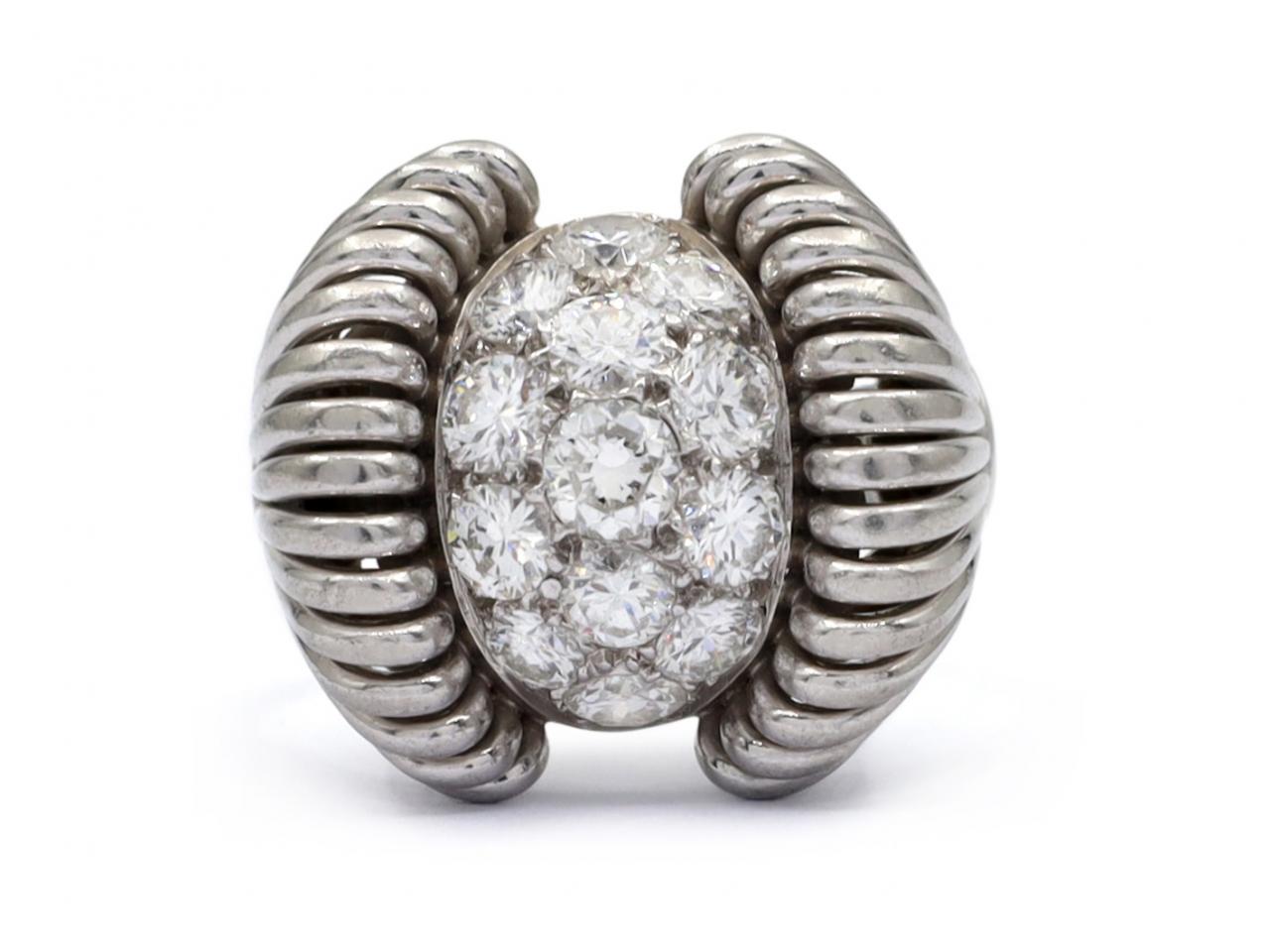 1940s French flared diamond set bombe ring in platinum. Set to the centre with thirteen round brilliant cut diamonds in grain settings, to a enclosed bombe design featuring smooth settings, flanked to either side by dramatic shoulders consisting of fifteen flaring wires whoch curl to meet the cluster and taper and join to the curving solid shank. Hallmarked platinum, French.